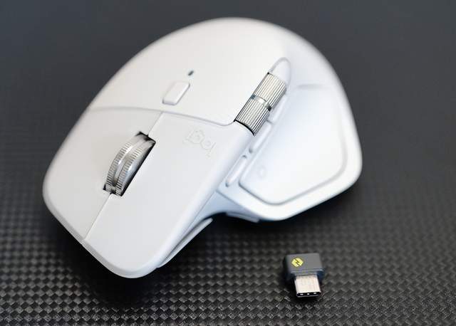 连接设备的便捷性也升级了不少。之前的老款蓝牙只能连三个设备,MX Master 4用附赠的USB-C接收器能存六个设备的配对信息,插在电脑上就能直接用,不用每次都重新配对。出差时带个笔记本和平板,切换设备时按一下按钮就行,再也不用像以前那样,每次切换都要在蓝牙设置里折腾半天。充电续航也没让人失望,上次忘了充电,应急充了一分钟,居然撑过了一下午的会议,完全充满后用了快一个月,电量还剩一大半。