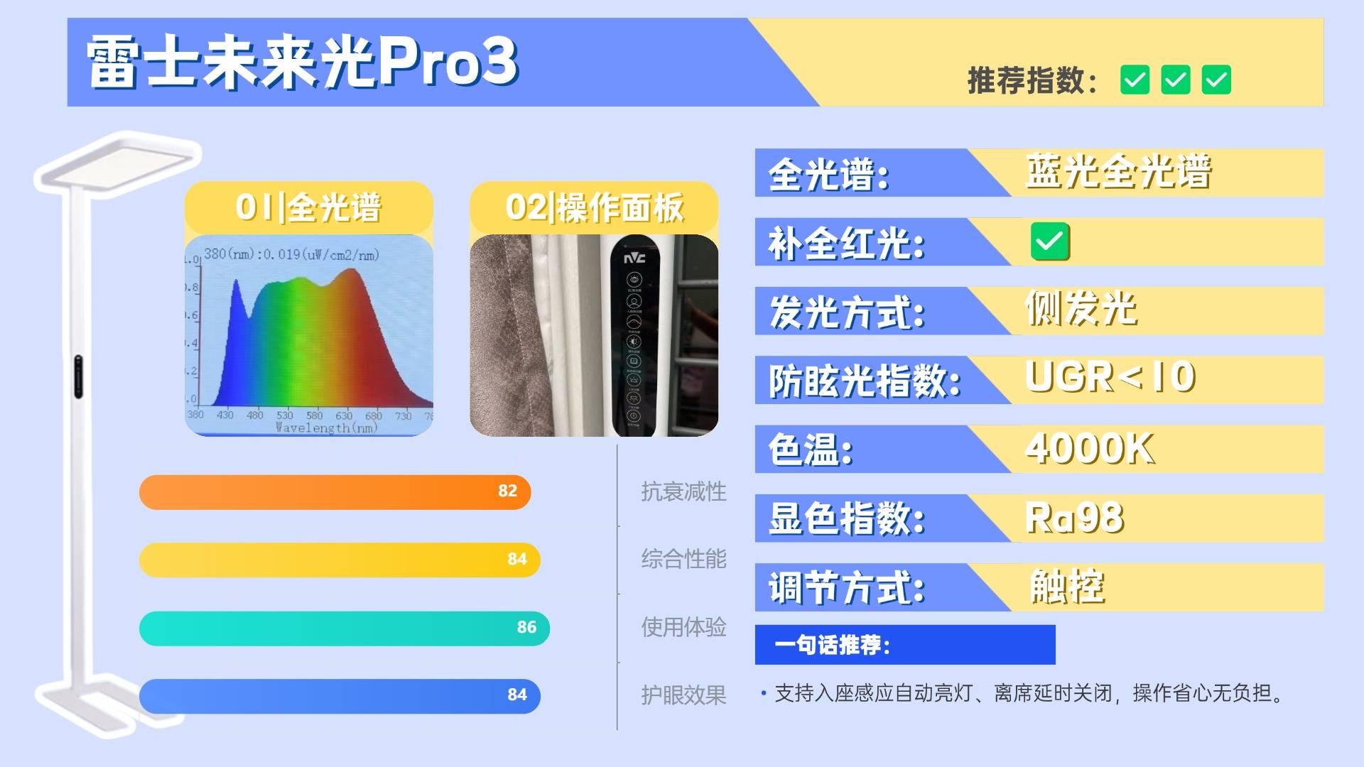 护眼大路灯排行榜前十名品牌有哪些?松下适阅D3000这款护眼大路灯和我比较推荐的书客SUN Pro一样,在核心光源上,采用的是紫光激发技术,能够有效的减少蓝光,实际蓝光在一个安全的范畴,并且呈现出来的光线灯光色彩都比较好,而在发光设计上,松下也是上下发光,并且发光面搭载了防眩光技术,有效的减少眩光,实际防眩光指数在UGR<10.1左右,功能上则是支持灯光调节以及入座感应等功能,总体来看,除了性能不强等下温度会有点高之外,其他的表现都还不错。