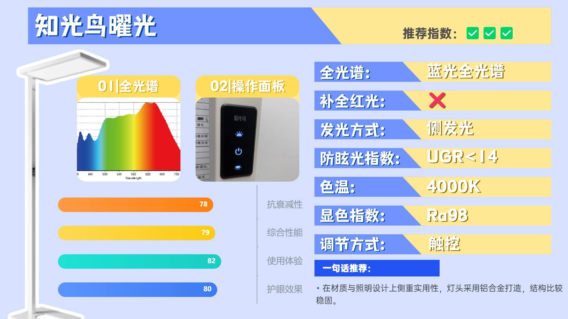 护眼大路灯排行榜前十名品牌有哪些?知光鸟大路灯采用一体化发光面,搭配上下双向出光设计,能够实现高达 10000lm 的光通量输出,照明覆盖面广且亮度充足。其显色指数达到Ra98,能很好地还原物体本色,让阅读、绘画等对色彩有要求的场景更真实,操控方式上,除机身触控面板外,还提供遥控器,调光调亮都很方便,但在光学还原方面仍有短板,自然光模拟能力相对一般,实测中可见一定的眩光,对视觉舒适度略有影响。整体来说,如果对护眼光学性能没有极高要求,它仍是可考虑的选择。