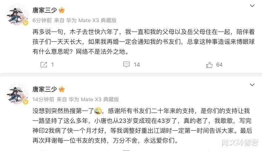 二、唐家三少宣布将停笔休息并澄清自己再婚的谣言24日,唐家三少发文:感谢所有书友们二十年来的支持,是你们的支持让我一路坚持了这么多年,小唐也从23岁变成现在43岁了,真的老了,我歇歇,写完神印2我病了快一个月才好,等我调整好重出江湖时一定第一时间告诉大家。