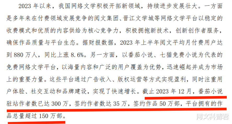 不过我最关心的是,这份报告中首次披露了当前番茄的一个作者现状。据报告中所述,截止 2023 年 12 月,番茄小说驻站作者数已达300万,签约作者数达35万,签约作品50万部,平台拥有的作品总量超过 150 万部。