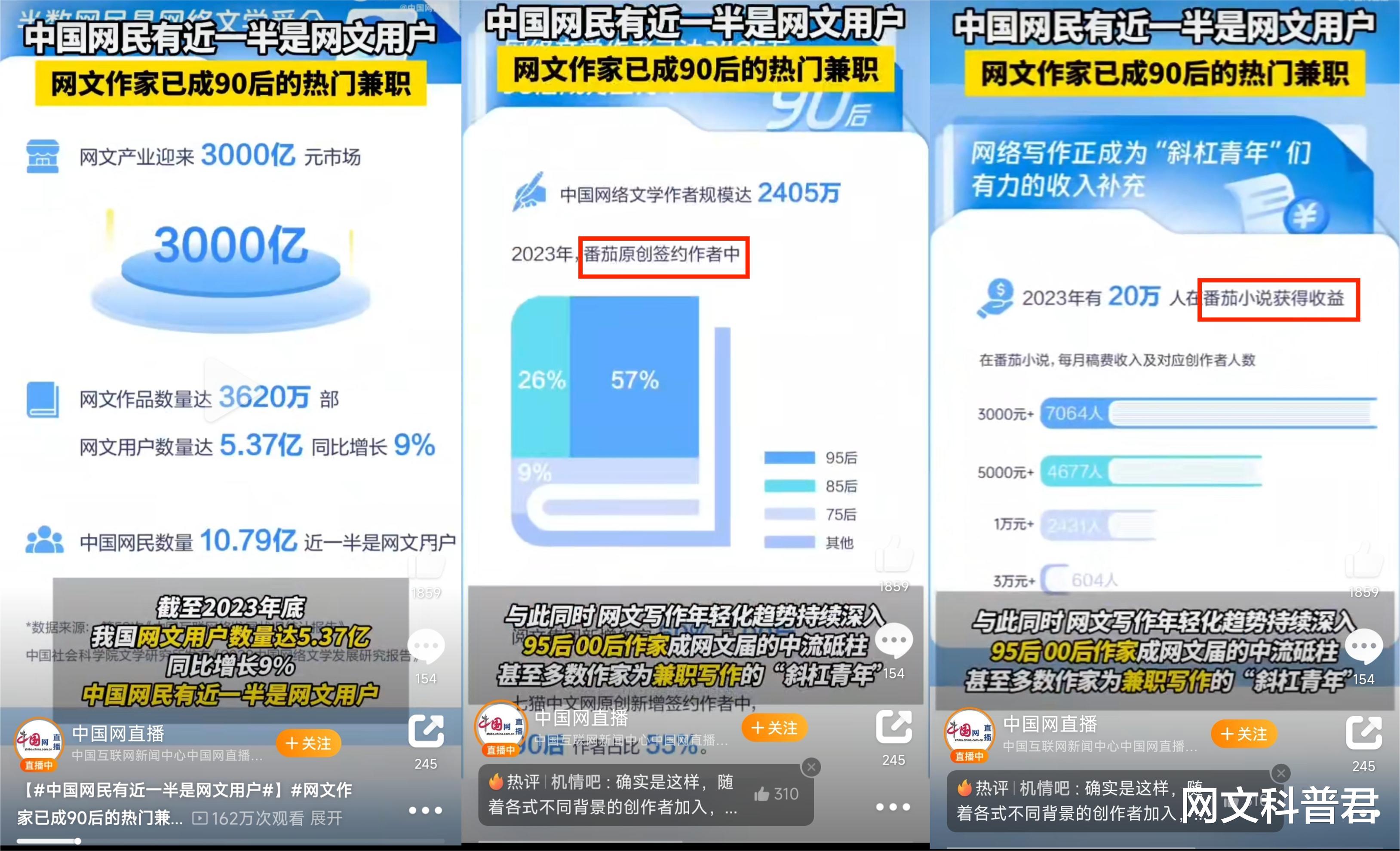 这个热搜的视频一共29秒,其中出现了三张报告中的数据图,除了第一张图是在描述当前网文行业的总体情况外,选取的另外两张图,一张是番茄的签约作者年龄结构,另一张是去年番茄获得收益的作者数,以及今年二月番茄发的作者稿费分布图。