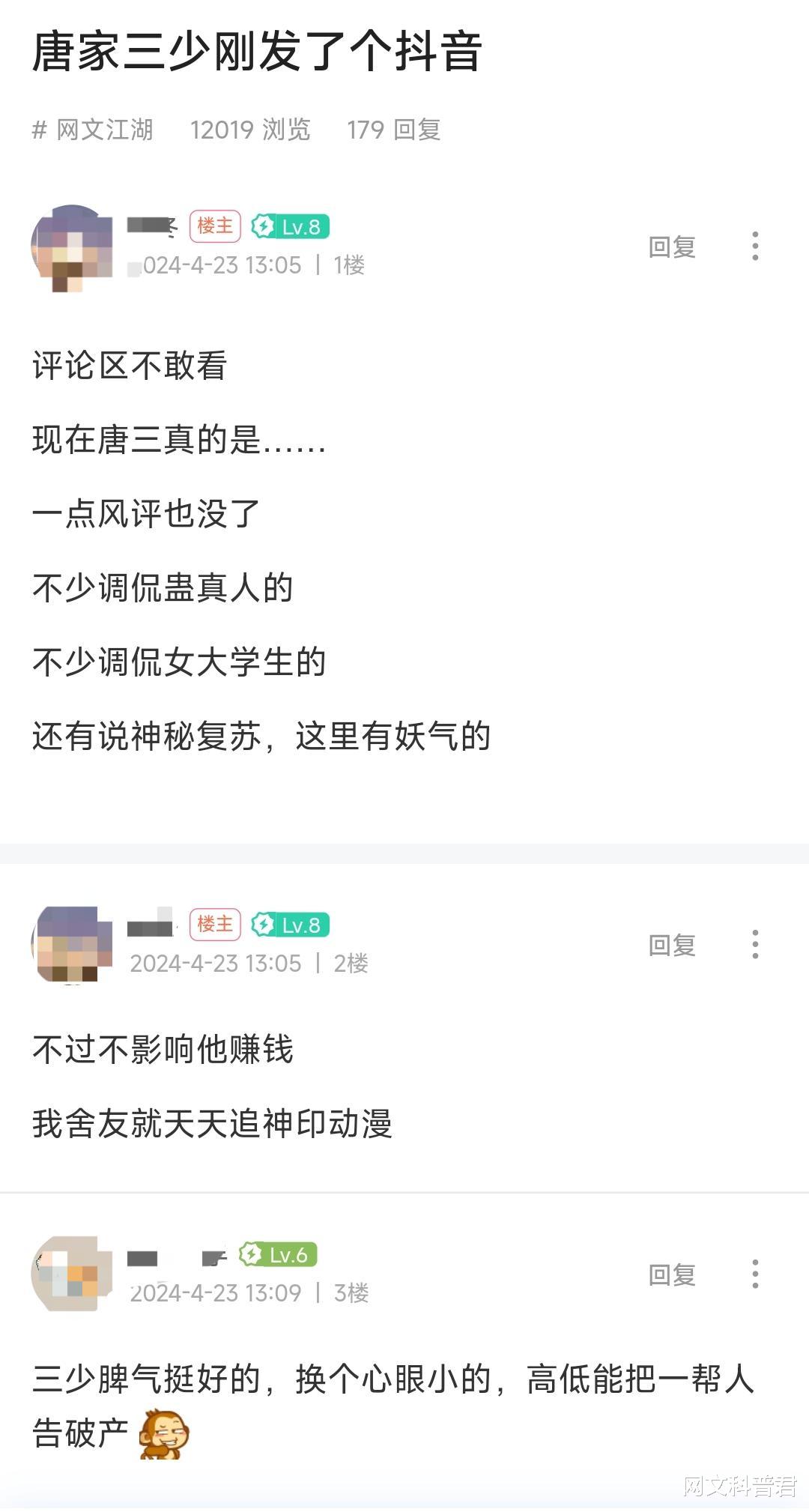相比之下,龙空作为专门的网文论坛,里面很多人都是那段历史的亲历者,评论显得理性了很多。不是一昧的跟风在骂,而是指出唐三就是个背锅的喇叭这个事实。(大家对于这事有疑问的话可以去龙空看看这个帖子,下面讲的都很清楚了,包括唐三净网这事的由来,经过,下面那些当年的亲历者,还有针对他的各种谣言啥的)