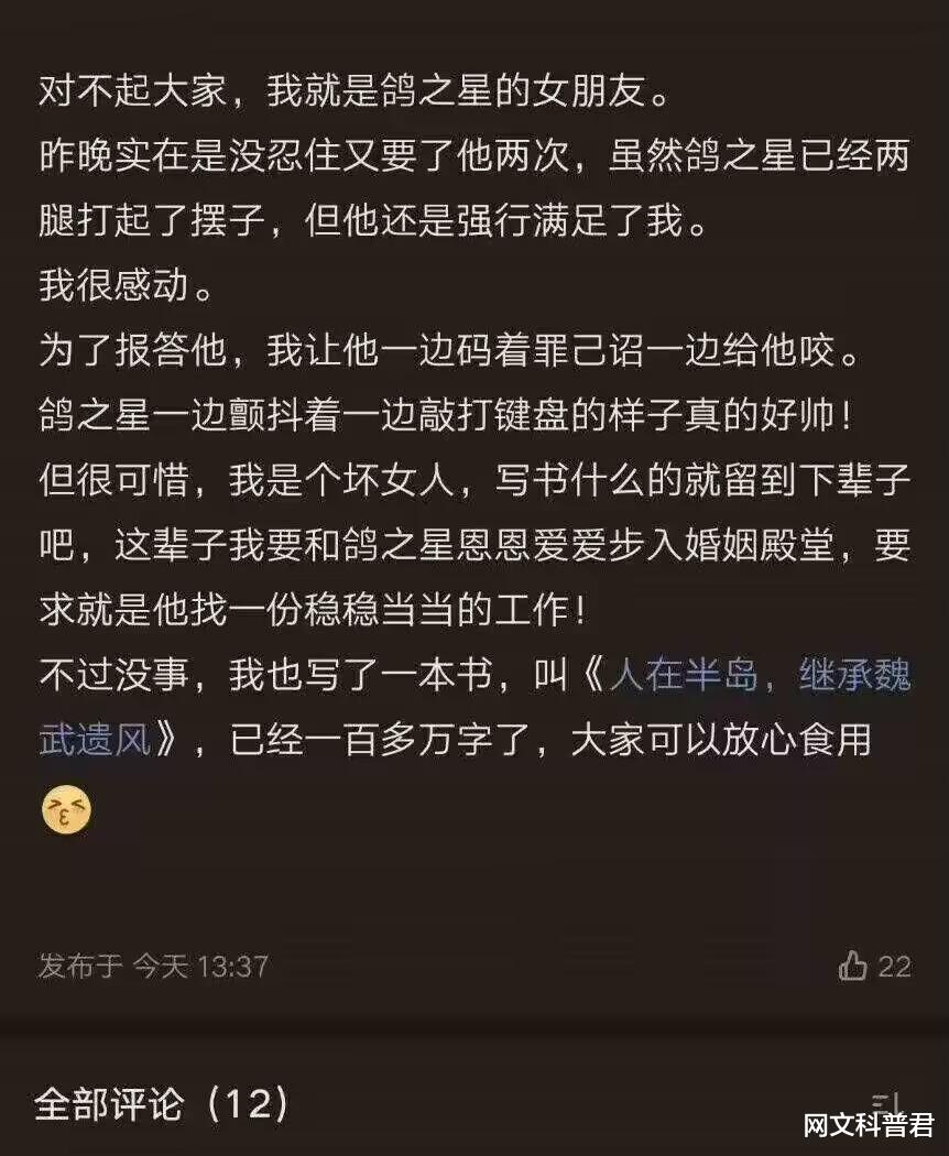 然后书友圈就有人自称是作者的这个女朋友,引了一波流量到他写的书那里。