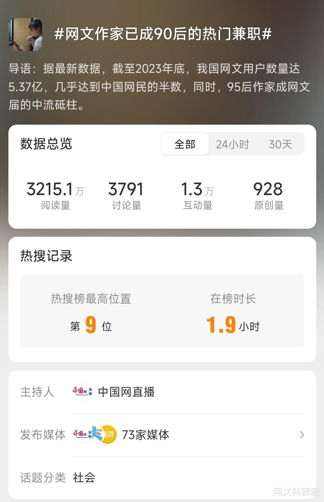 23日,网文作家已成90后的热门兼职的话题登上了热搜。因为在22日,新闻出版研究院发布了《2023-2024年网络文学平台价值研究报告》(以下简称“《报告》”)