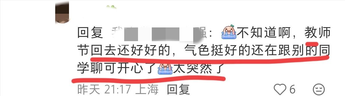 就在教师节的时候,隔壁班的学生还能看到她气色不错地和大家聊天,大家都以为凭借她那股不服输的劲头,至少能多坚持一段时间,或许还能创造生命的奇迹。她是那样优秀的闵行区先锋党员,带领着学生拿下一个又一个大奖,代表学校站在论坛上侃侃而谈,她的未来本该有无限的可能,本该有更广阔的讲台。