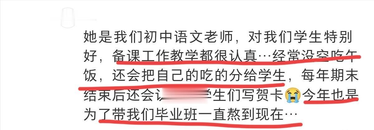 她为了毕业班的孩子们,在今年春天已经不舒服的情况下,依然没有选择检查治疗,等后面发现的时候已经没有治疗方案了。