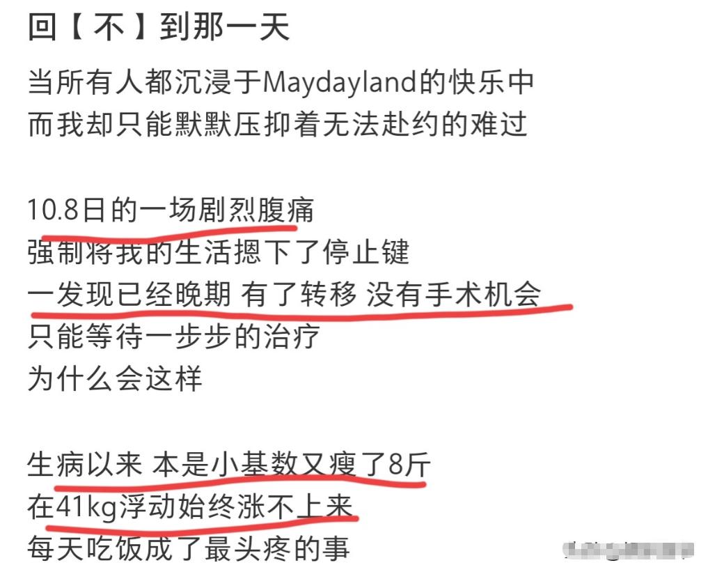 然而,病魔来得太快太凶,不仅剥夺了她的健康,也剥夺了这些微小的快乐。11月5日,当大家都沉浸在五月天乐园的狂欢中时,她只能躺在病榻上,用颤抖的手指发出一条动态:“我只能默默压抑着无法赴约的难过……”那张原本属于她的演唱会门票,终究没能等到它的主人。