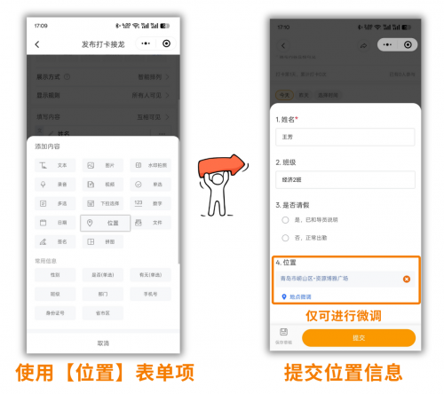 可以设置【位置】表单项进行定位签到,签到位置仅可在定位内微调,无法篡改。