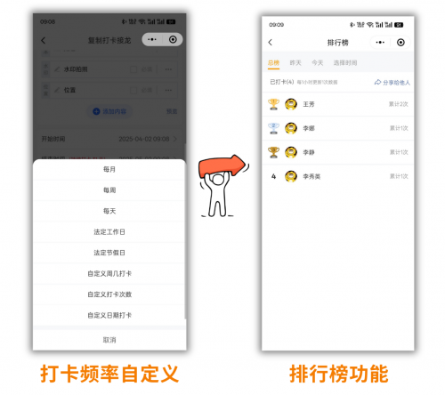 再根据需要设置打卡频率,可以按照每天、法定工作日等多种方式打卡,一学期的出勤情况一条接龙轻松统计。