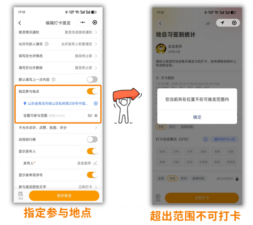 也可以指定位置签到,超出范围无法参与接龙,确保全员到场