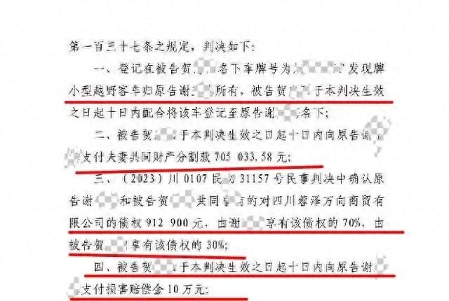 2025年10月24日,小谢告诉现代快报记者,武侯区人民法院判决登记在贺某名下越野客车归小谢所有;在判决生效之日起十日内,贺某向小谢支付夫妻共同财产分割款705033.58元;确认小谢和被告贺某共同享有的对四川某商贸有限公司的债权912900元,由小谢享有该债权的70%,由被告贺某享有该债权的30%;被告贺某于本判决生效之日起十日内向原告小谢支付损害赔偿金10万元。“他们共计应该给我现金144万余元。”