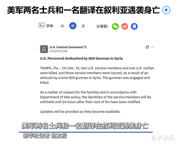 一切始于一场致命袭击。12月13日,美军在叙利亚中部帕尔米拉附近巡逻时,遭武装分子伏击,2名美军士兵和1名美籍翻译当场死亡,3人受伤,袭击者被击毙,身份被美方认定为“伊斯兰国”(ISIS)成员。