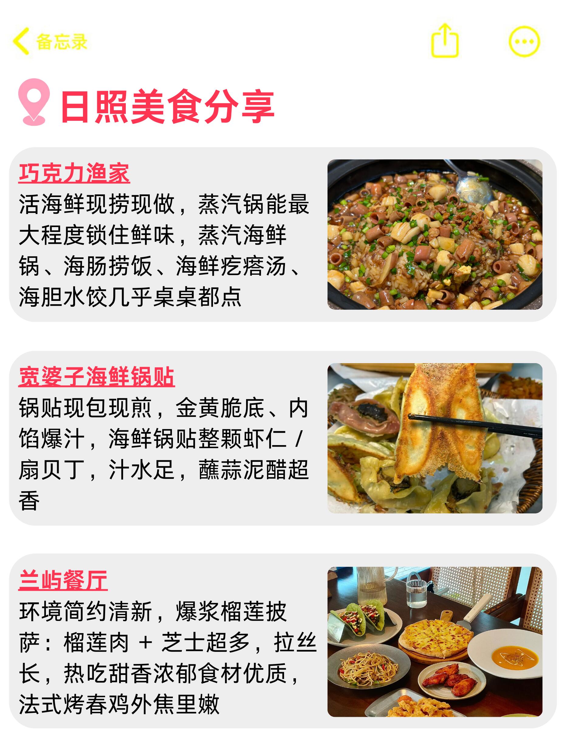 ✅日照美食是去宽婆子买了海鲜锅贴,现煎的,外皮焦脆,里面是海鲜加韭菜,一口一个停不下来;海鲜🦀别乱吃,巧克力渔家就是现点现做,做法也多样,去这就行,个人比较推荐蒸汽海鲜锅和海肠捞饭🍤😋