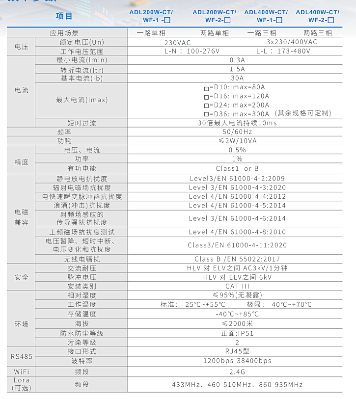 核心配置:搭载 ADL200M/ADL400M 系列电表,支持双路计量与相序调整,提供有线通讯与无线通讯两种选择。