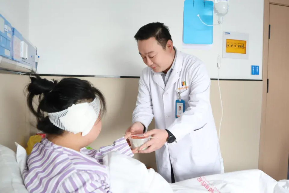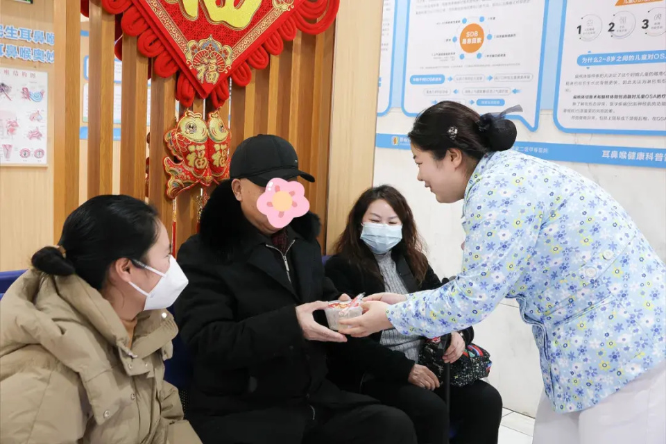 冬季是耳鼻喉疾病的高发期,住院患者中,不少是被耳聋、耳鸣等问题长期困扰的老年人,更需要耐心细致的关怀。钱院长来到一位老年患者的病床前,亲手递上饺子,关切询问近期恢复情况,叮嘱注意休息、保持良好状态。老人接过饺子,连连道谢:“感谢你们,让我感受到家的温暖。”