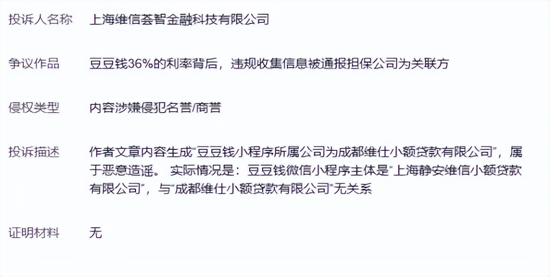 这次措辞更加简单粗暴,其投诉称“作者文章内容生成”豆豆钱小程序所属公司为成都维仕小额贷款有限公司",属于恶意造谣。实际情况是:豆豆钱微信小程序主体是”上海静安维信小额贷款有限公司",与”成都维仕小额贷款有限公司"无关系”。”