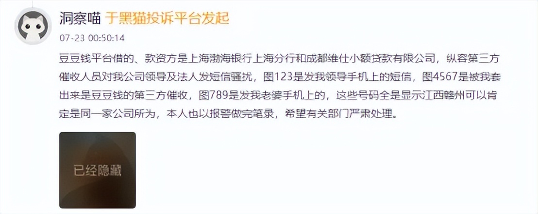 事实上,在今年7月份的投诉中,还有借款人提到豆豆钱的放款方有成都维仕小贷公司。