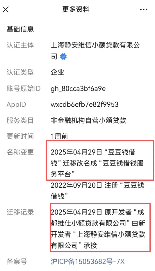 微信小程序的信息显示,2025年4月29日,豆豆钱小程序的名称和认证主体公司都做了变更和迁移,原开发者“成都维仕小额贷款有限公司”由新开发者“上海静安维信小额贷款有限公司”承接。