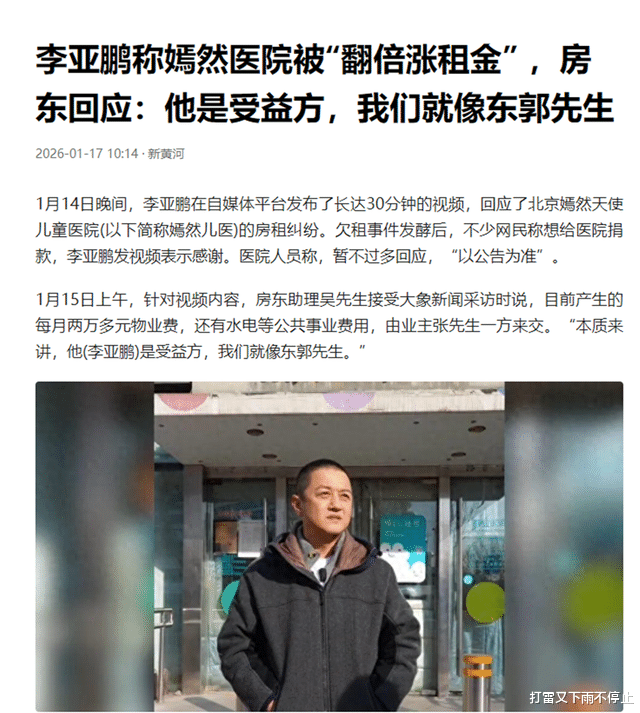 知情人的爆料让争议更激烈,房东说期间主动减免租金,可医院说上涨后的部分根本无力承担,双方各说各的,李亚鹏名下有不少资产,却让公益医院独自扛租金压力,有点说不过去。