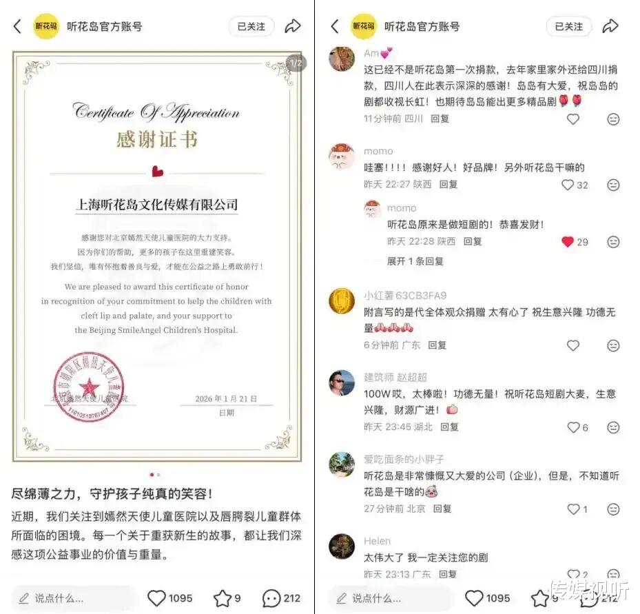 当听花岛的善举落在唇腭裂儿童的手术台上,落在四川山区困境学子的书页间,以听花岛为代表的网络视听和微短剧力量,正在编织一幅从个体善意到行业自觉、从单向捐赠到生态共建的温暖图景。
