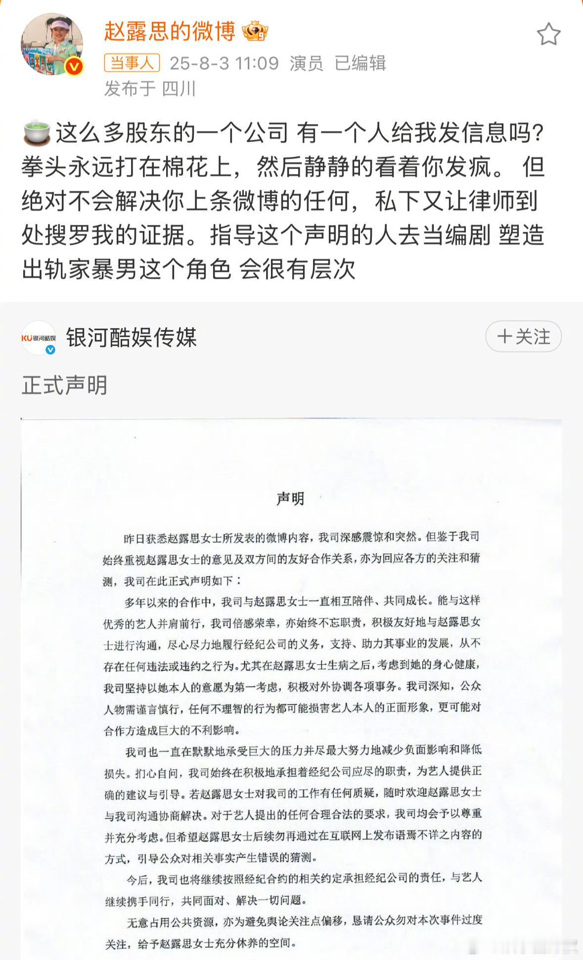 银河酷娱声明这个声明怎么感觉公司没有想和赵露思解约的意思呢[闭嘴],还说要“共同