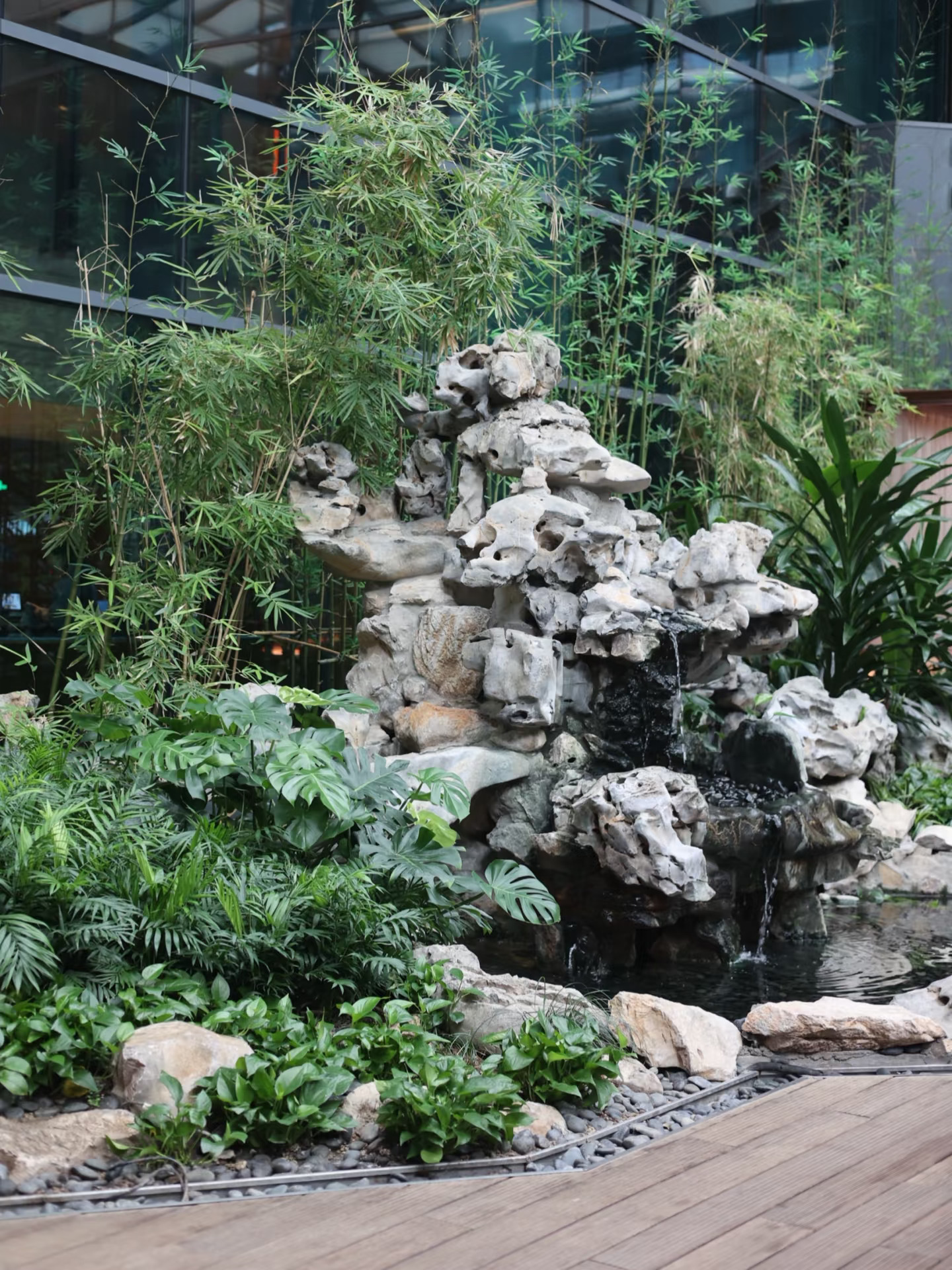 一进门就被惊艳到!藏在酒店大堂的「中庭茶苑」简直是都市桃源🎋!竹林掩映假山流水,墨竹屏风配中国红软装,仙气缭绕的糕点端上桌时,也太出片了!”
