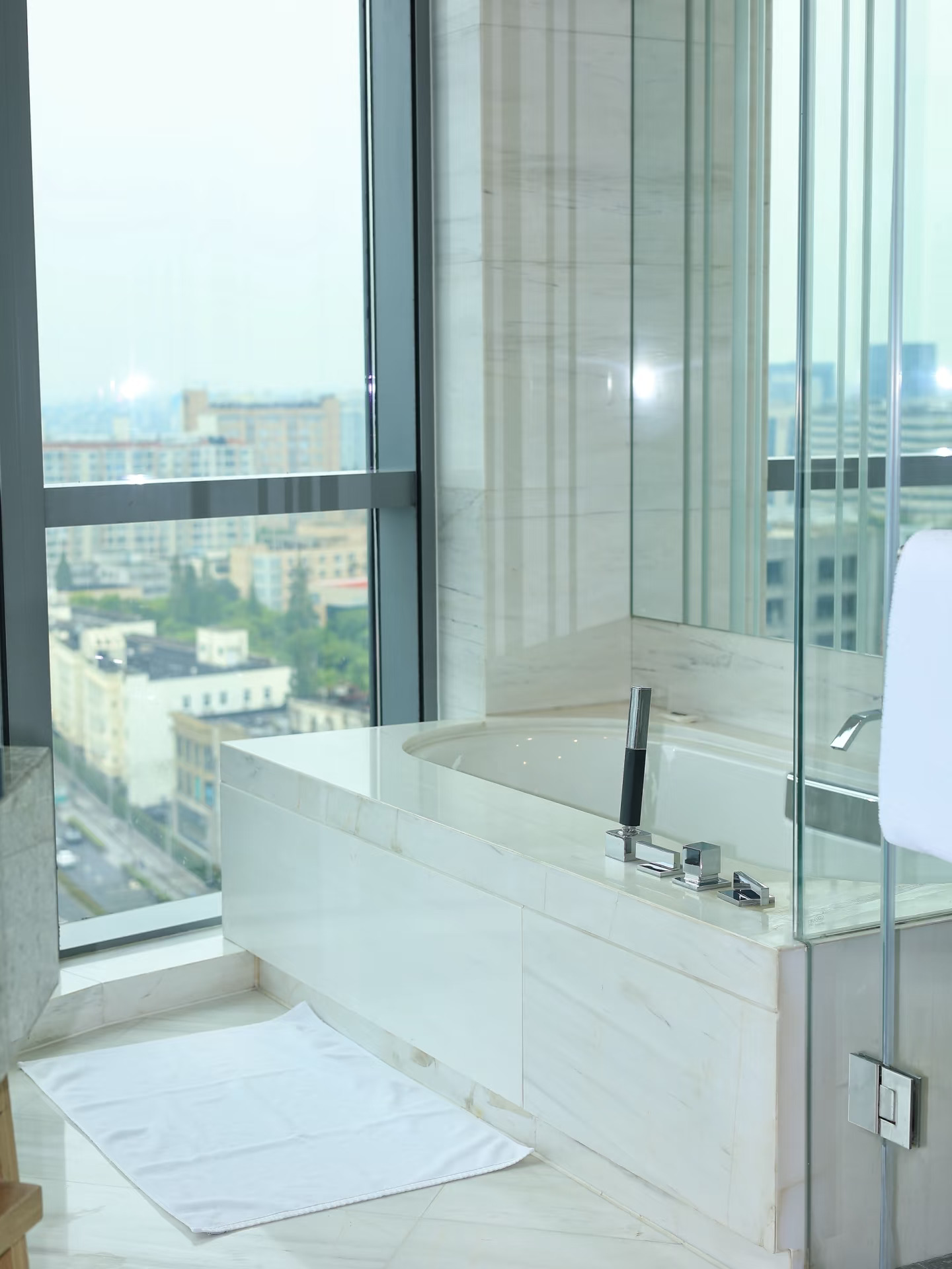 房间体验:落地窗可以看到“五角场彩蛋”夜景🌃,暴走2万步后在浴缸🛁泡澡+追剧瞬间回血~