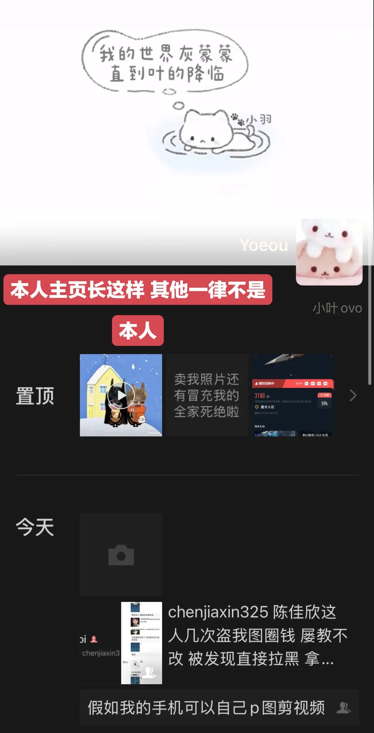 chenjiaxin325 陈佳欣小姐 我的忠实粉丝 我从无数人口中认识了你 我也警告过你很多次 你几次盗我图圈米 屡教不改 被发现直接拉黑 拿我照片扩列 骗取别人钱财 干的事还妄想我给你处理好吗 你做的坏事凭什么我来承担 甚至我还要因为你这个无赖背上骂名 大家不要放过这个dao图狗(^-^)