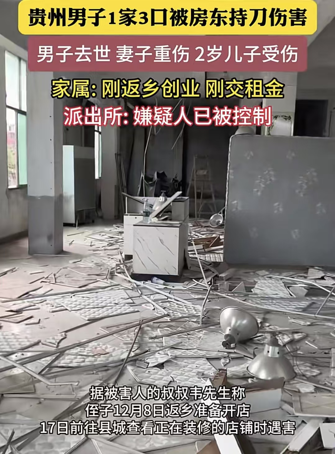 2025年12月17日下午,贵州贞丰县建设路附近发生一起恶性刑事案件,让一个怀揣返乡创业梦想的家庭瞬间陷入绝境。一名刚从浙江义乌返乡的男子,在与房东签订三年租房合同并付清租金、着手装修店铺的第九天,遭遇房东持刀袭击,最终当场身亡;其妻子受重伤,未满两岁的儿子也被伤及,母子二人紧急送医救治。嫌疑人已被警方当场控制,事发地街道办及社区已介入善后工作。