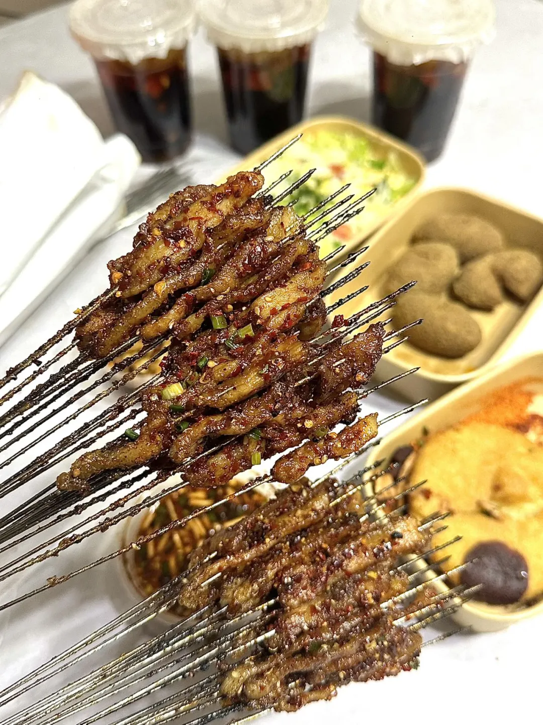 微微焦边的肉串鲜嫩多汁折耳根蘸水是灵魂