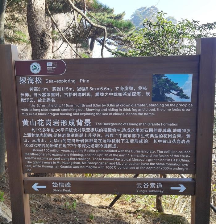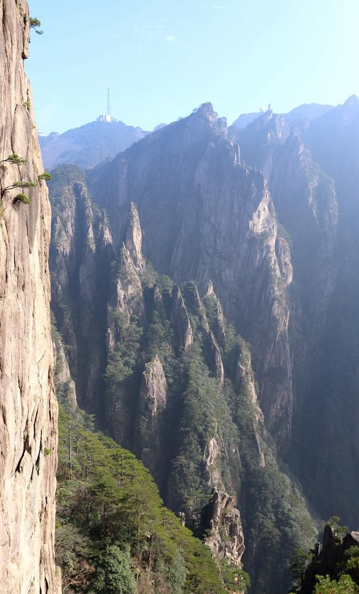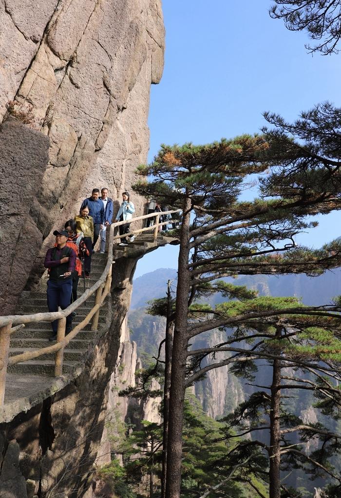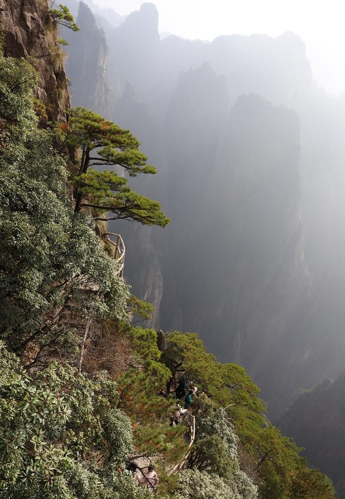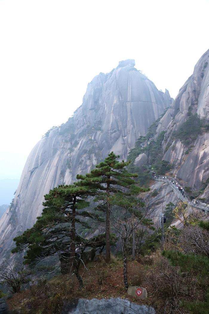 到了天海景区,已经下午四点多了,我还要赶到玉屏楼景区。我加快了步伐。途中,还要爬一个百步云梯,很陡很难爬。我奋力爬了上去。 终于在下午五点多到达玉屏楼景区了,我加快了步伐,想早点去看看此处的核心景点迎客松。