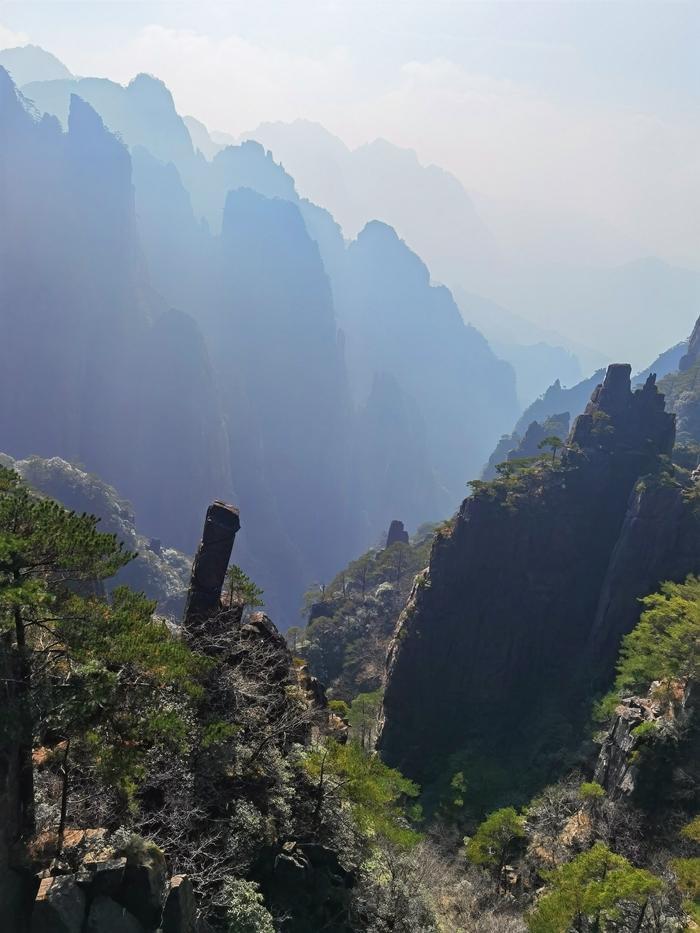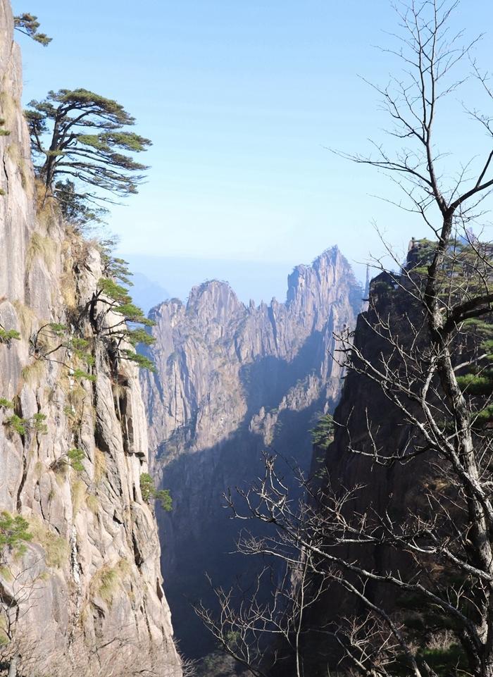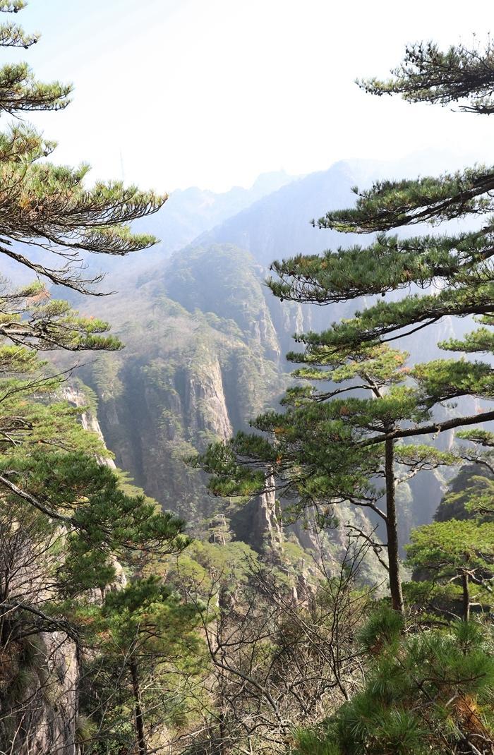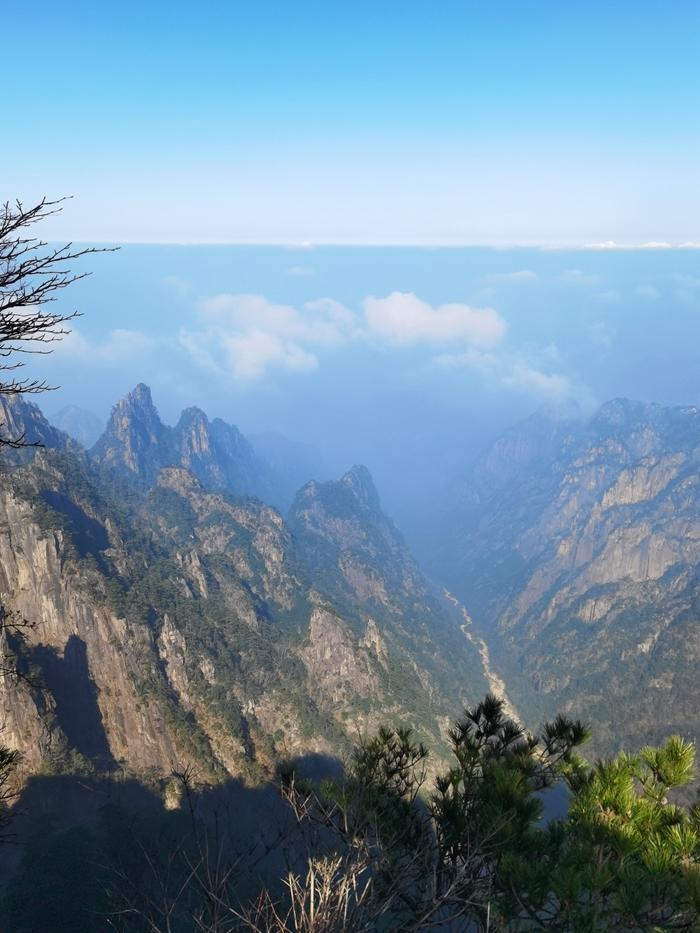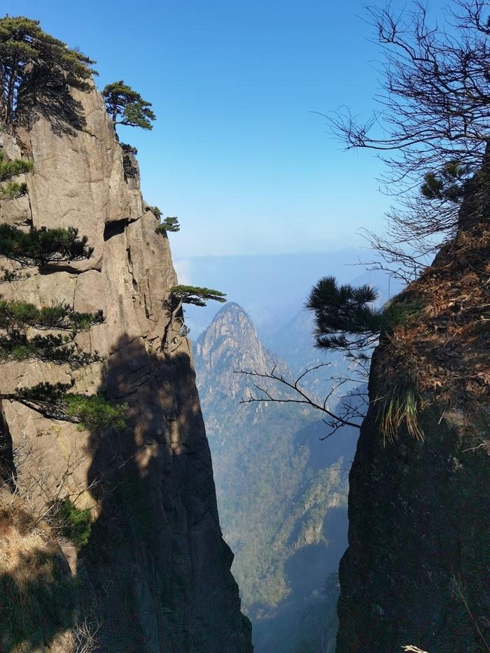 大峡谷的山沟深不见底,我们一直下山,走了两个小时还没走到峡谷底,这让人感受到黄山的神秘感。