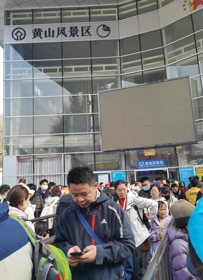 看到索道站前的情景,又在心里暗暗叫苦,怎么又是这么多人呀! 这回排队的时间更长,我有更多时间探寻为什么黄山旅游会有这么多人?是旅游旺季吗?不是。是有什么活动吗?不是。我问了身边的本地人,他们说,今天是周六,他们全家人就来出游了。问了一个外地来旅游的小伙子,他说,他看了天气预报,这里明天有雨,所以他就赶着今天来。还有一个本地人对我说,今天还好,黄山一年四季的游客都很多,如果遇到旅游旺季,那就更是拥挤了。