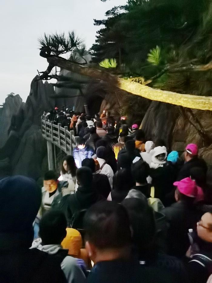 可是现实让我失望了,到迎客松的道路被游客堵住了,因为这条路也是到玉屏索道的路,当天此时要坐索道下山的人太多,所以,大家只好排队,队伍很长,据说有几公里。大家只能慢慢地一步一步朝前挪。
