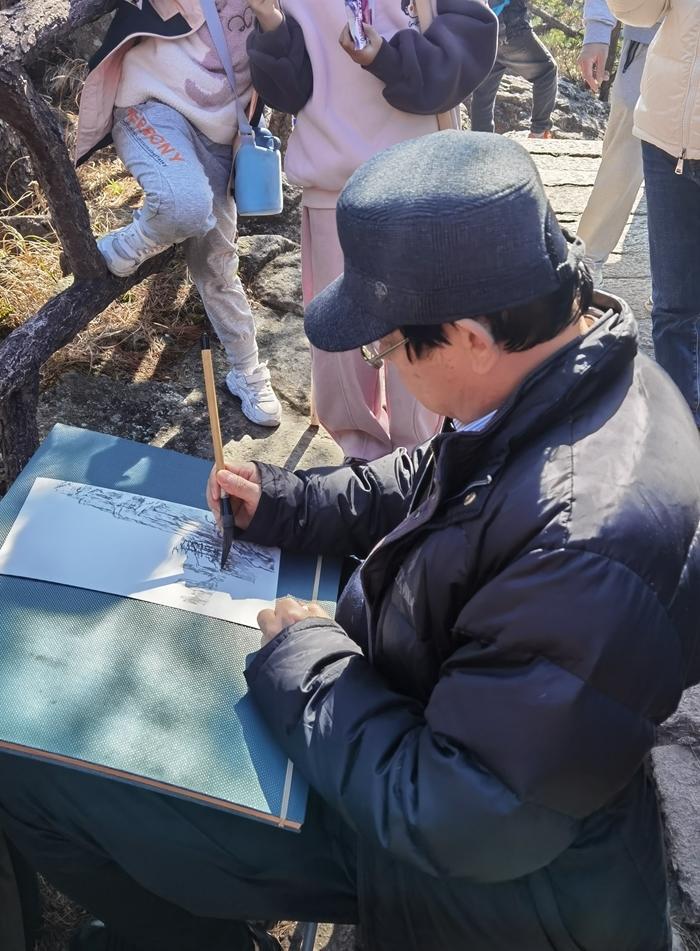 黄山的山峰,千姿百态,有的高耸入云,有的此起彼伏,重峦叠嶂。山峰上处处都有青松点染。 一棵棵巍然挺立的黄山松,如一枝枝神奇的画笔,给五百里黄山抹上了生命的色彩,和山峰一起,构成了一幅幅精美的山水画。 美丽的风景,引来许多画家来黄山采风和写生。