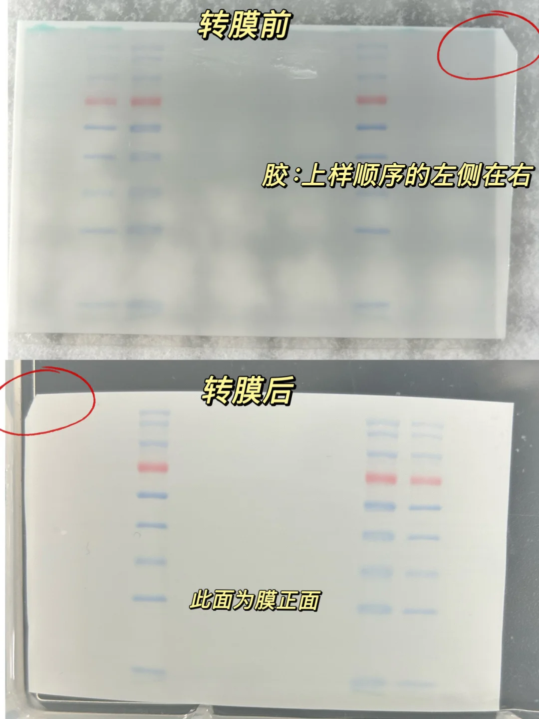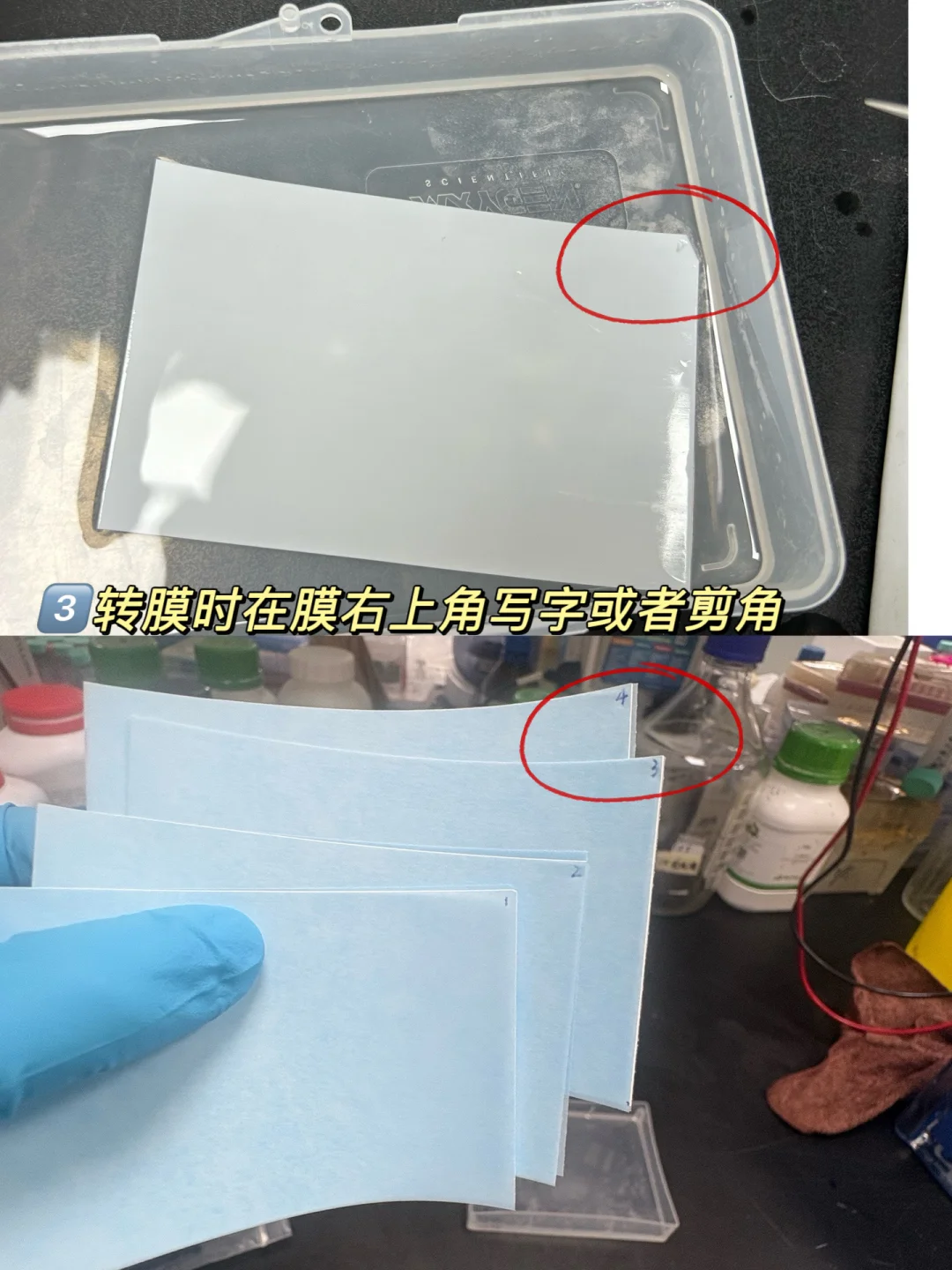 3️⃣转膜前在PVDF膜右上角写字或者剪角,转膜后缺角在左上角为PVDF膜正面
