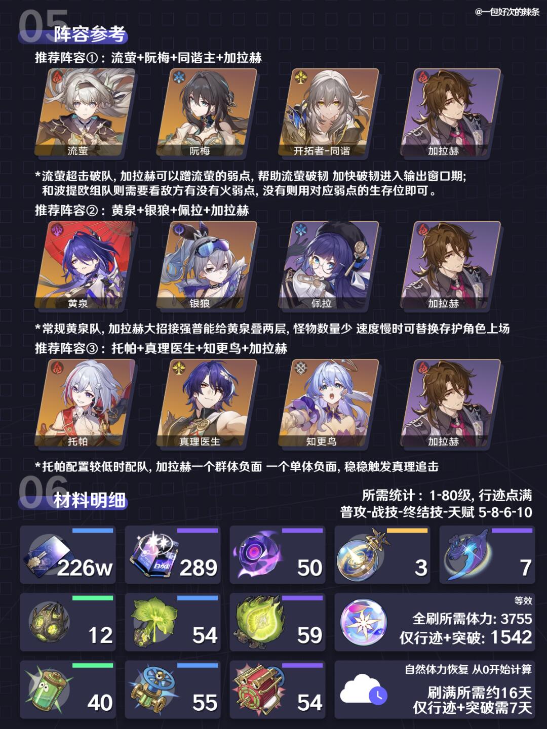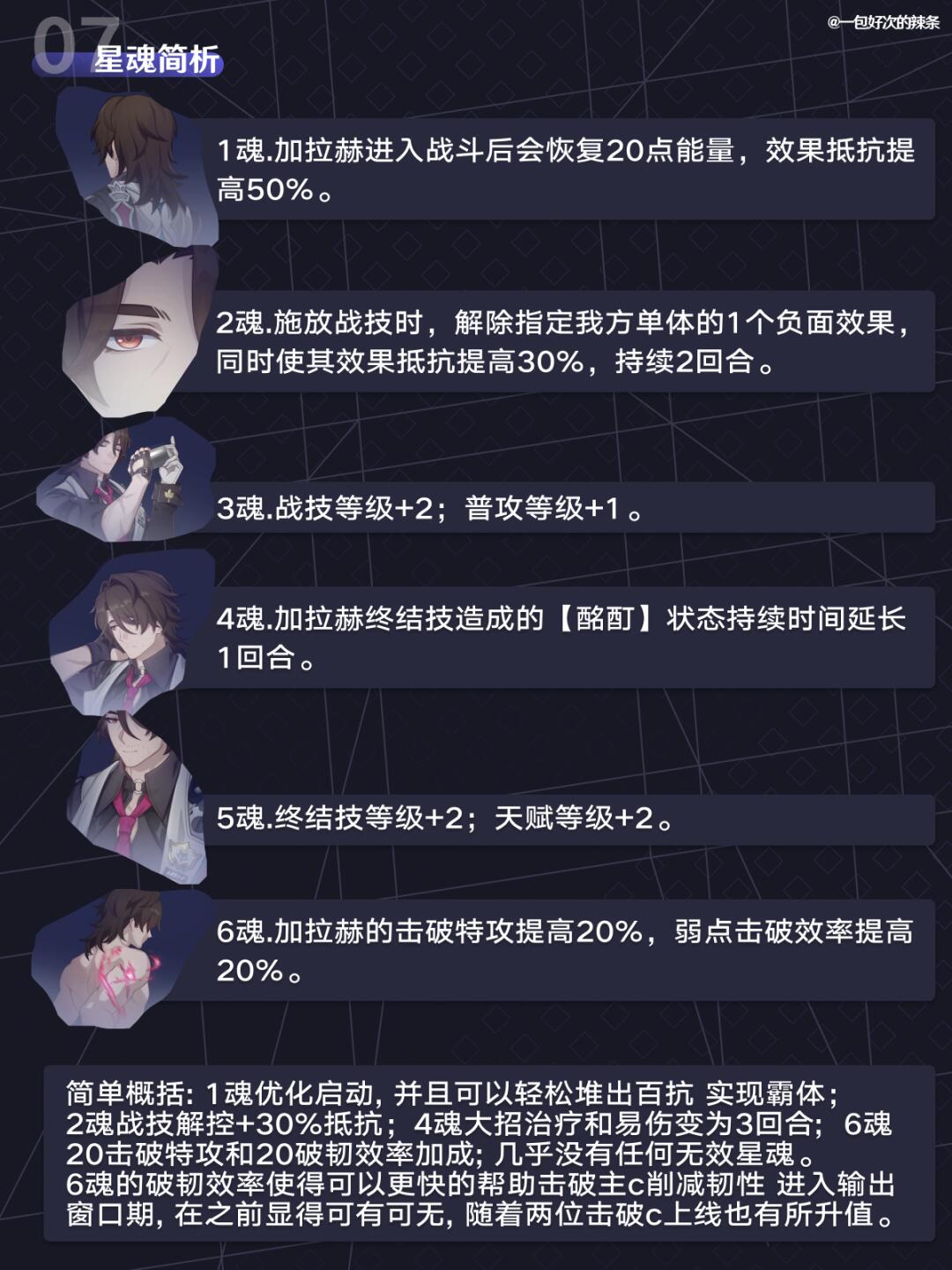 大家好,这里是一包好次的辣条! 加拉赫作为目前机制最优秀的生存位之一 不仅契合黄泉和真理医生,和新兴的超击破体系也有着极高的契合度 没想到这么快就迎来复刻,今天结合以往的使用体验和数据带来一份超详细的『加拉赫』培养攻略! ————————————— 如有遗漏/错误欢迎指出, 共同进步~ 最近新玩家/回坑玩家多,大家友善讨论哦~ ————————————— 我已经等不及补满命加拉赫啦,另外2.3版本的活动可以自选加拉赫哦~ (找图时发现图1这张加拉赫好像加持良治,以前都没发现)