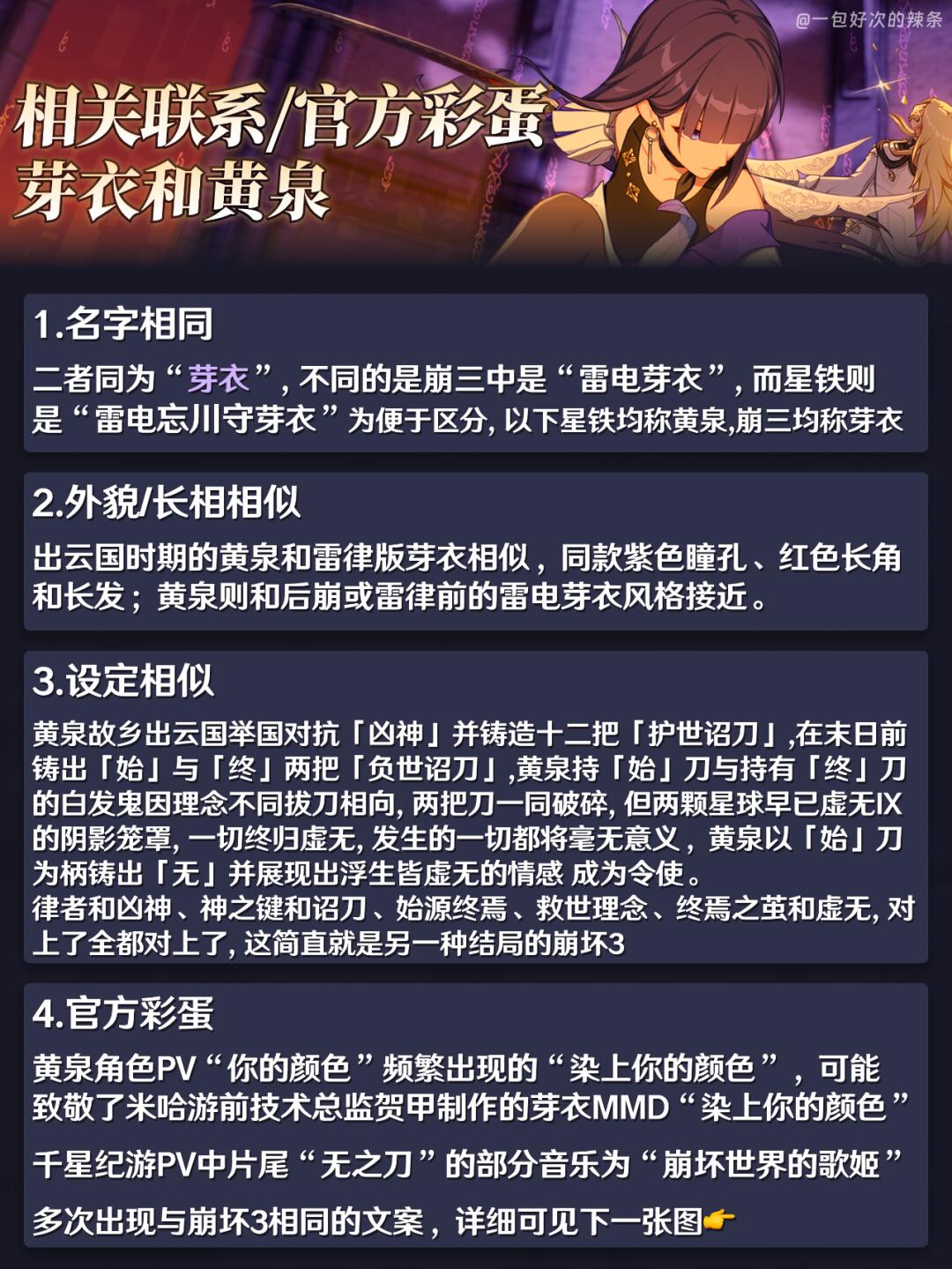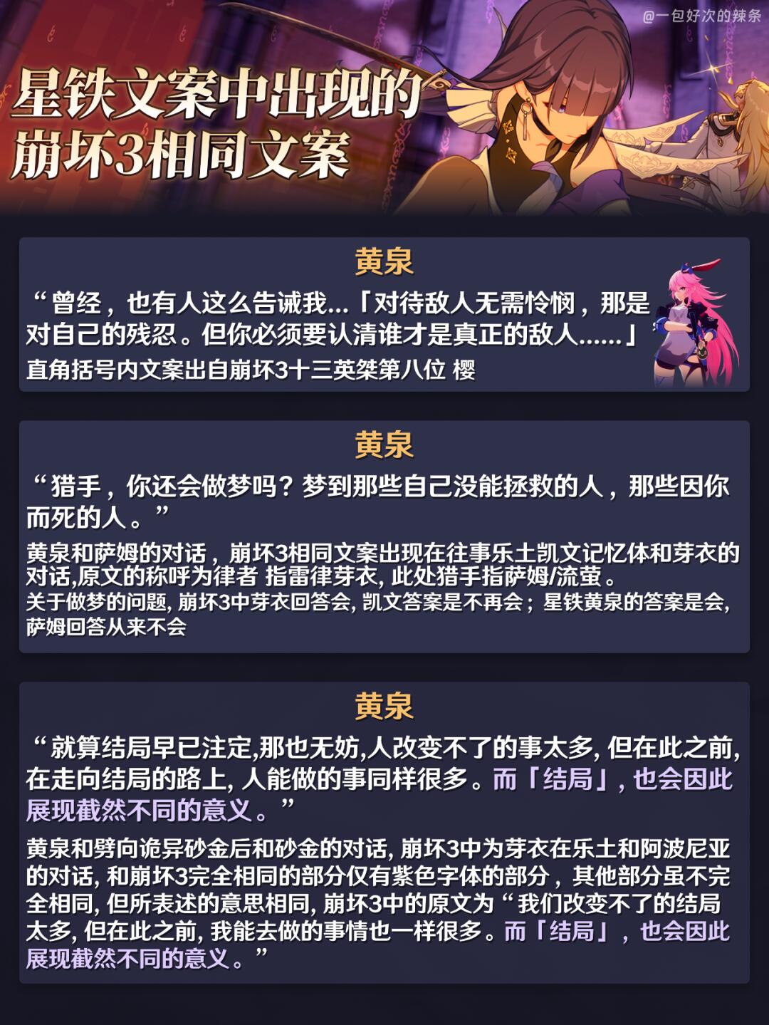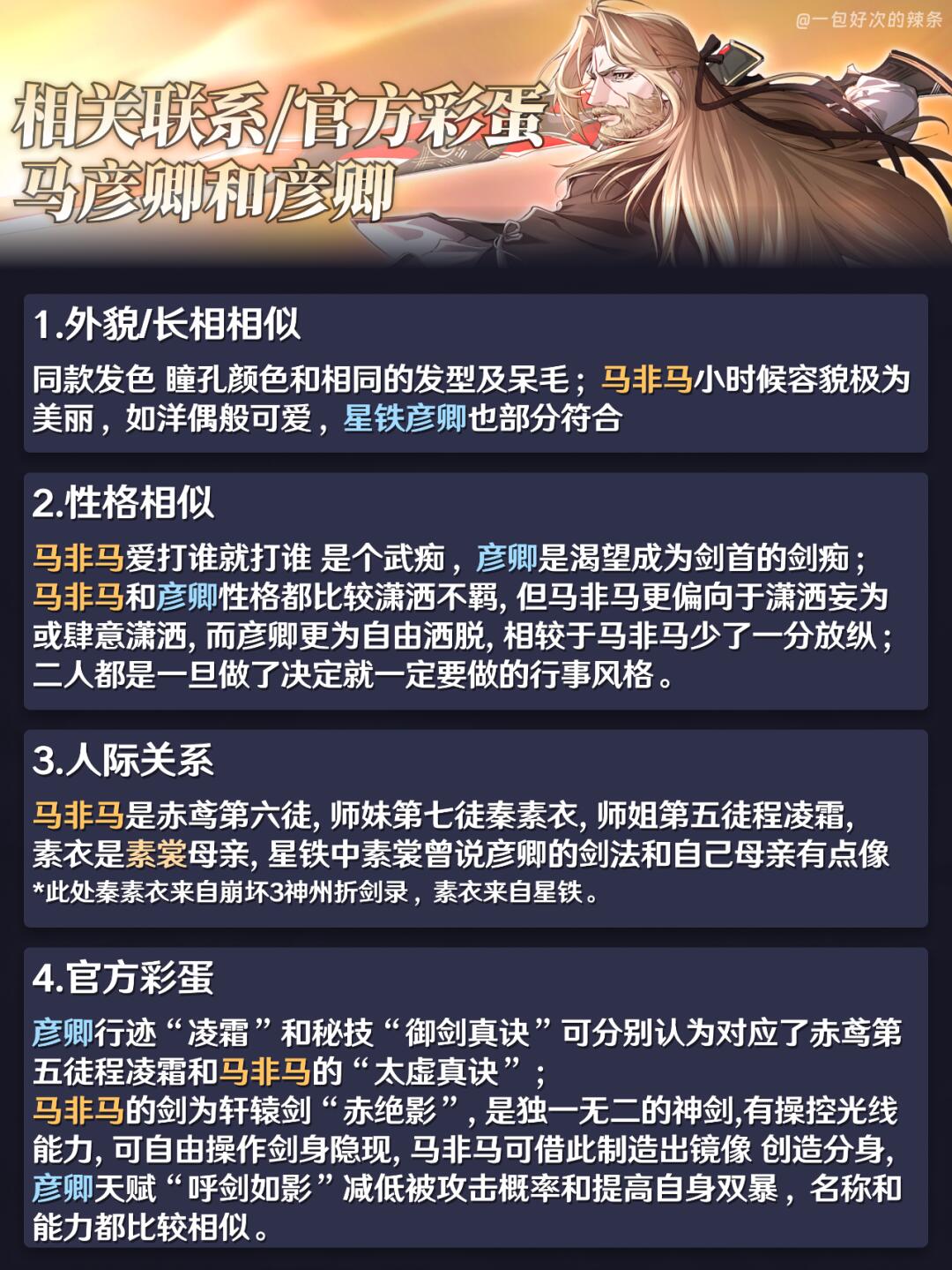 大家好,这里是一包好次的辣条! 前面两篇尝试发现反响还不错~恰逢最近大伙都打完了2.2新剧情,结合新剧情的信息一起来看看这位虚无令使还有早在开服就已实装的彦卿吧~ ————————————— 作为崩坏系列的老玩家,在星铁中见到了很多与崩坏3中神似的角色 目前的更新计划中还剩下 希儿和娜塔莎 初次尝试剧情向内容 如有遗漏/错误欢迎指出,共同进步~ —————————————