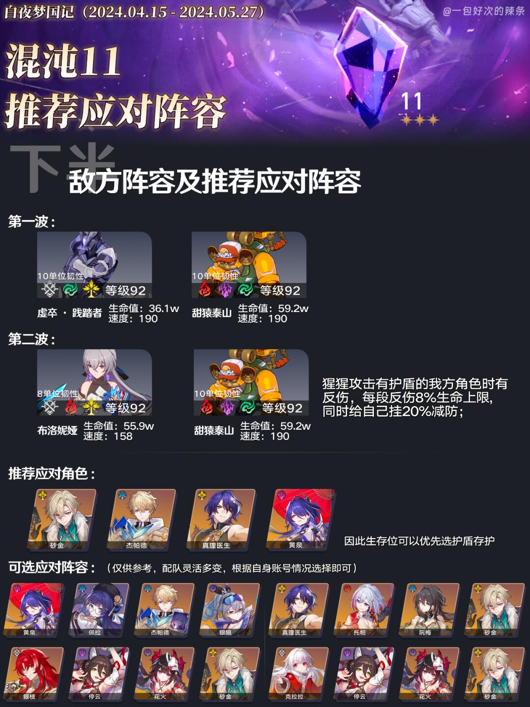 👋大家好,这里是辣条~ 📜本期是混沌回忆(白夜梦国记)11层的阵容推荐 🔍12层以及buff分析在主页哦~ ————————————— 如有遗漏/错误欢迎指出,共同进步~ 最近新玩家/回坑玩家多,大家友善讨论哦~ —————————————