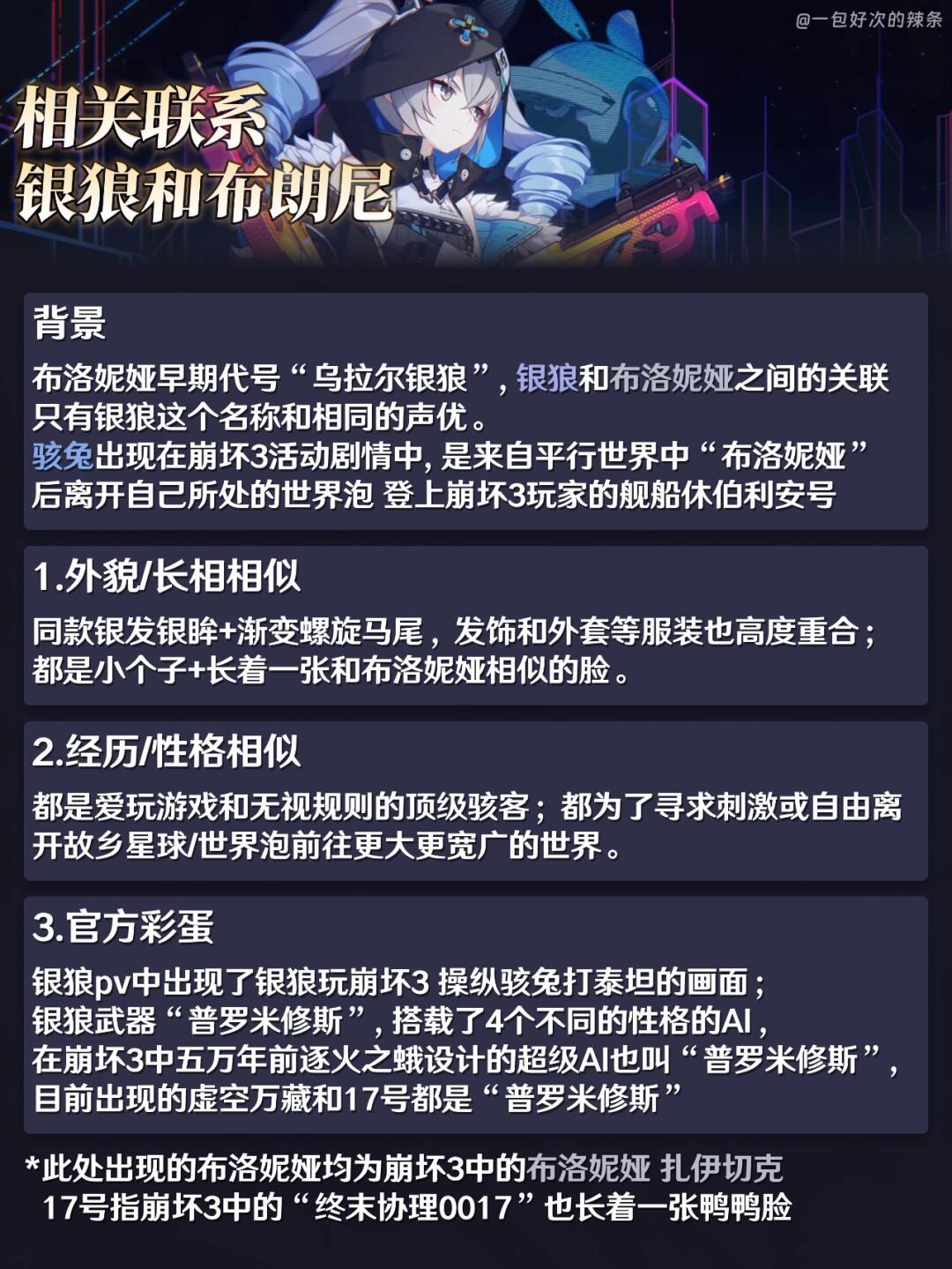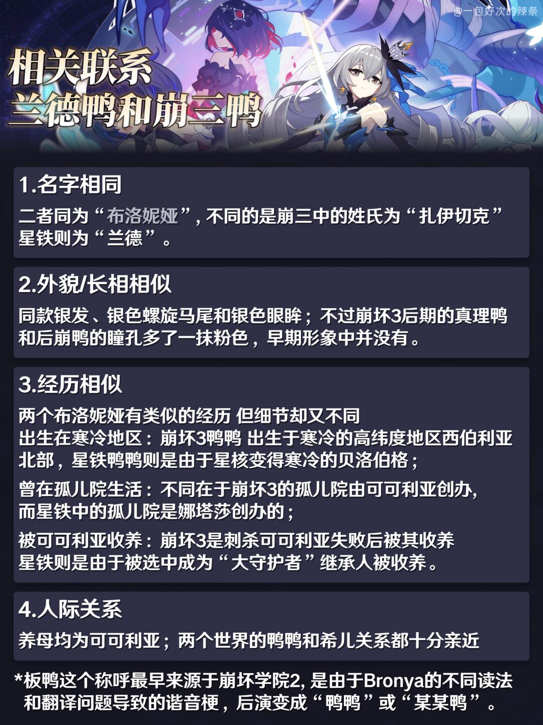 大家好,这里是一包好次的辣条! 上期尝试了新内容后反响还算不错~ [飞吻R]因此再加更一期 ————————————— 作为崩坏系列的老玩家,在星铁中见到了很多与崩坏3中神似的角色, 目前已盘点了五位角色,更新计划在还有彦卿 希儿 娜塔莎 黄泉 初次尝试剧情向内容,如有遗漏/错误欢迎指出,共同进步~ —————————————