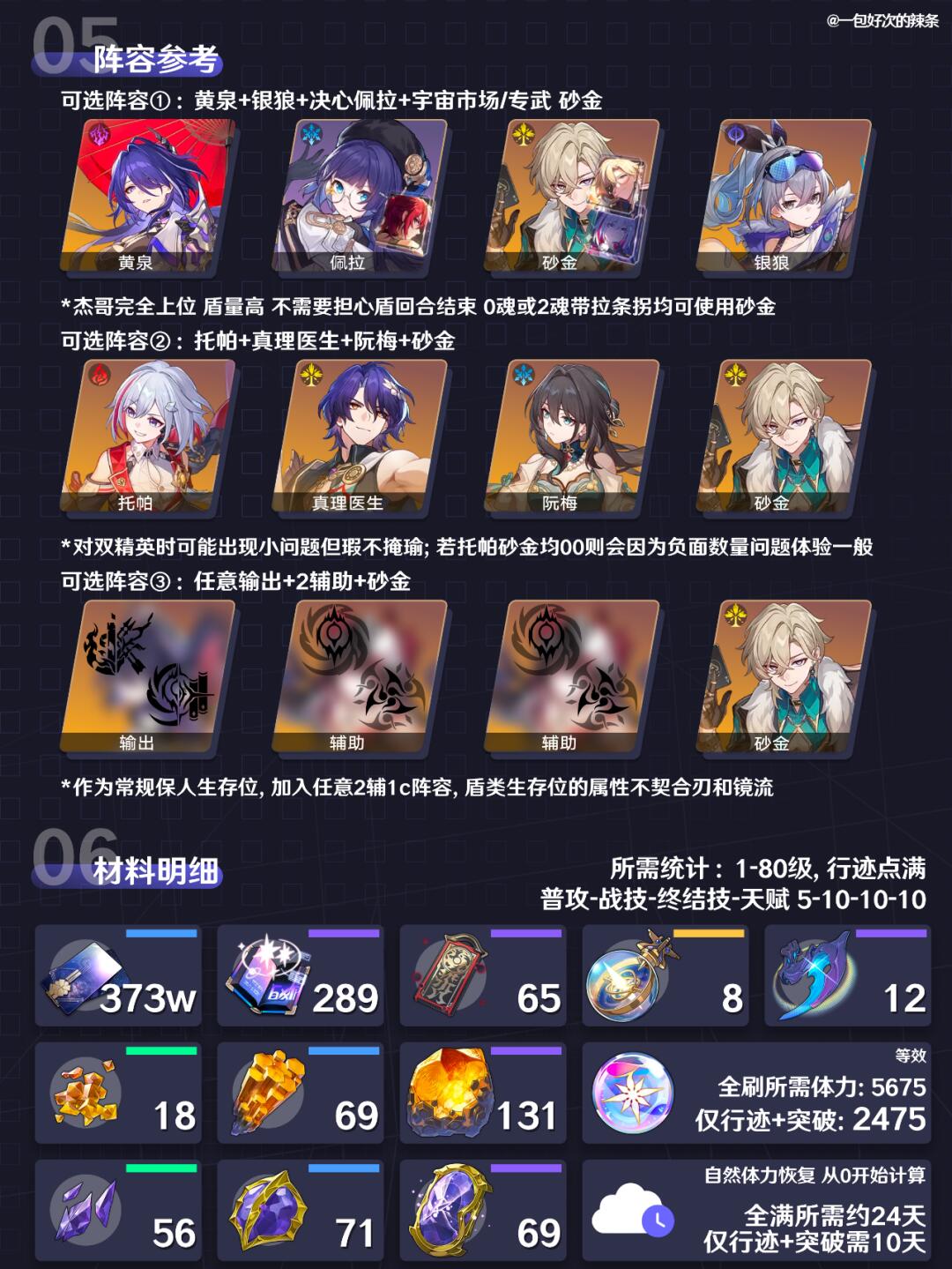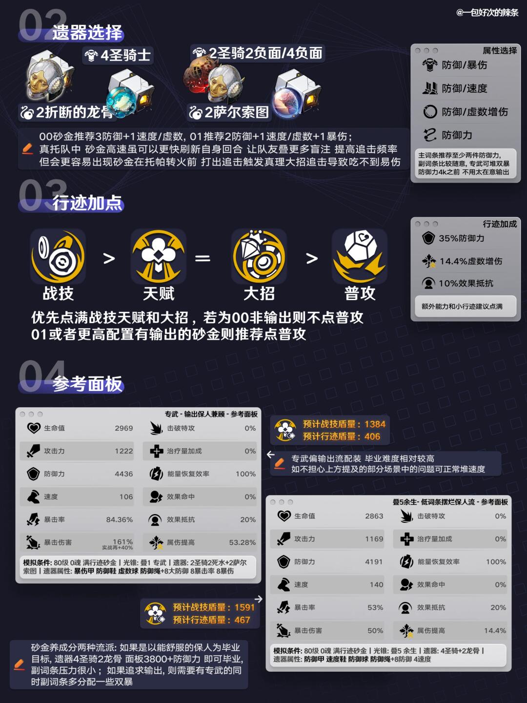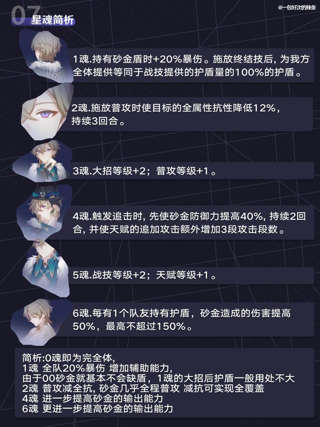 大家好,这里是一包好次的辣条! 砂金卡池今天更新 给大伙带来砂金的超详细培养指南 涵盖光锥遗器 行迹加点 参考面板 配队 养成 星魂浅析以及50抵抗的作用 ————————————— 如有遗漏/错误欢迎指出,共同进步~ 最近新玩家/回坑玩家多,大家友善讨论哦~ —————————————