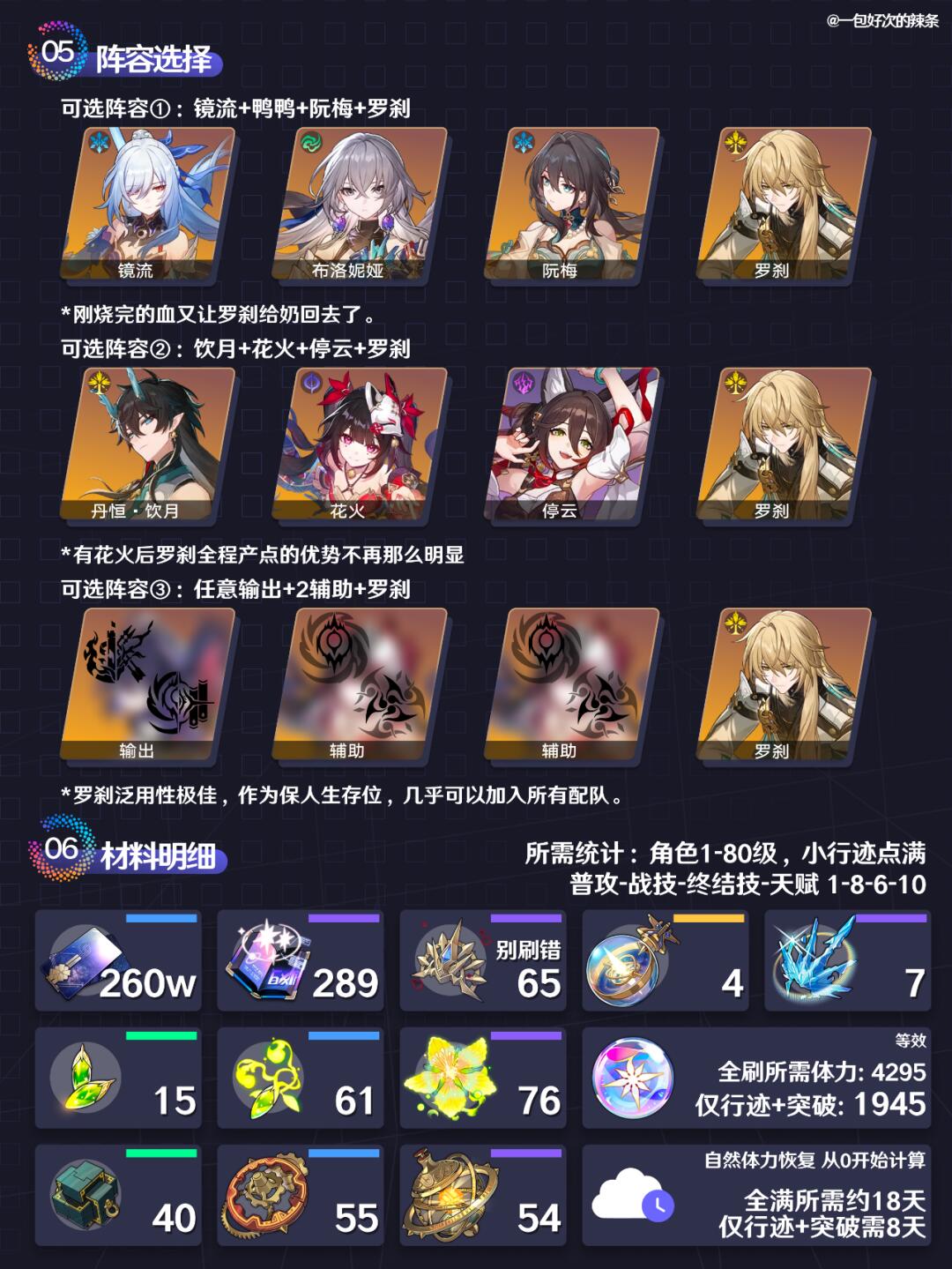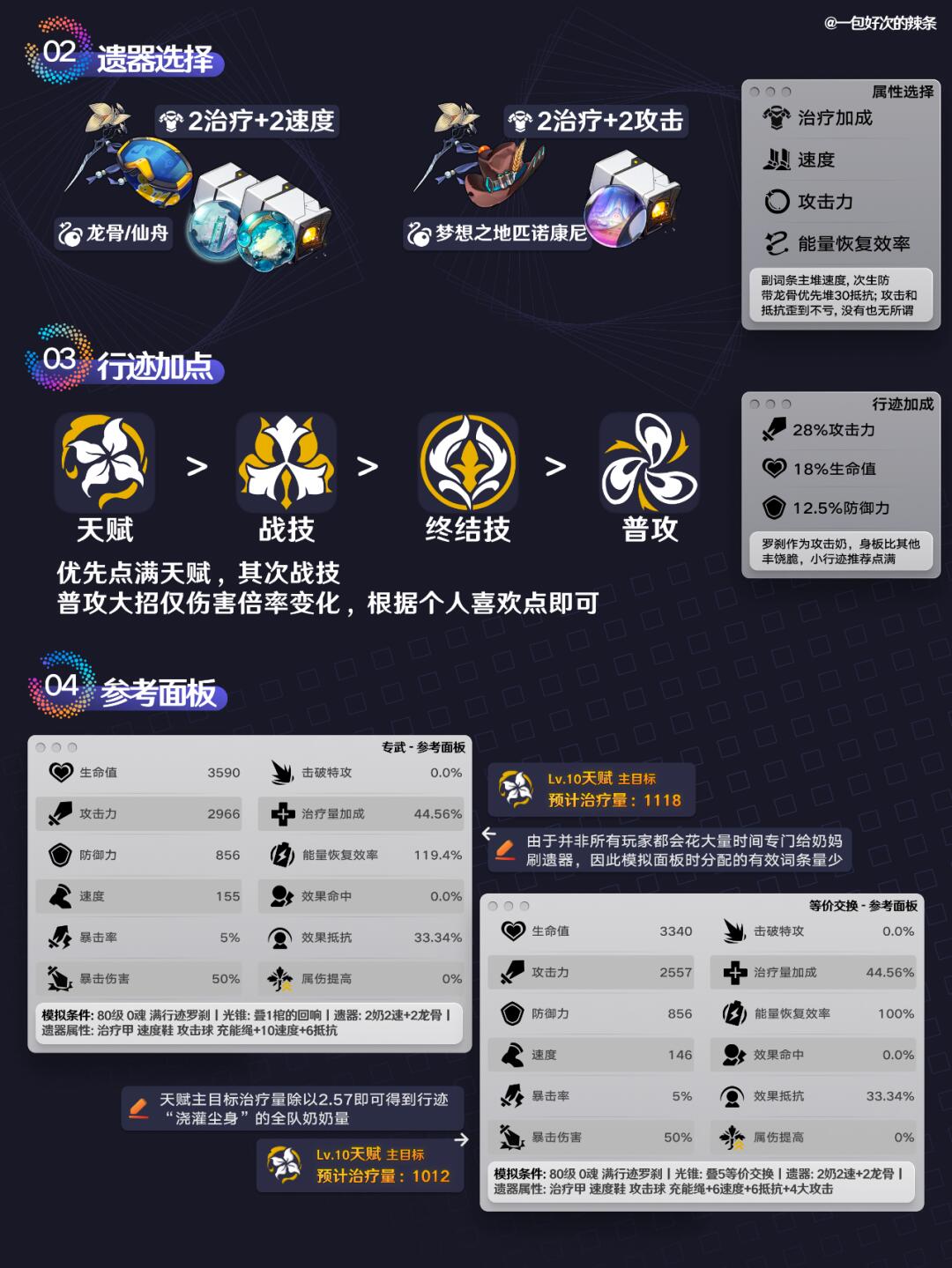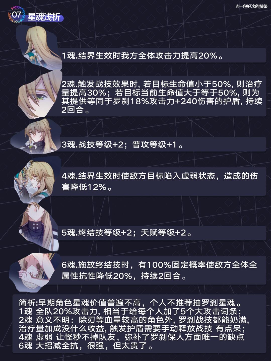 行迹中70%的“控制抵抗”和“效果抵抗”为不同乘区,罗刹在“控制类负面状态”时,“效果抵抗”的收益会衰减到只有30%,因此堆效果抵抗的收益并不明显,需要达到30%甚至更高才能感受出明显区别,而龙骨套恰好需要30%抵抗触发全队暴伤效果,因此这里个人给出的建议是30%左右的抵抗即可,如果是百抗厨,我建议玩加拉赫。