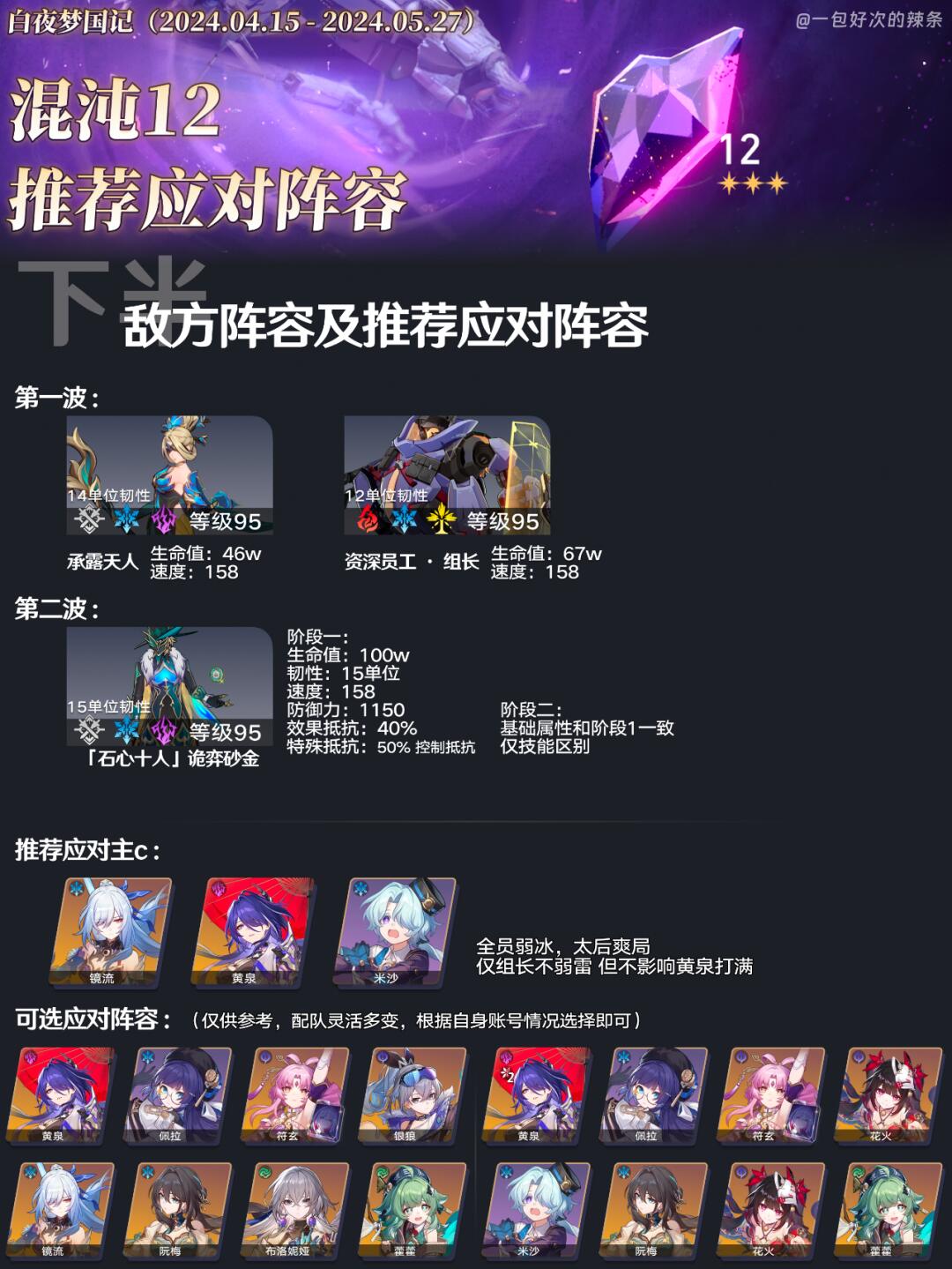 👋大家好,这里是一包好次的辣条! 📜本期是混沌回忆(白夜梦国记)12层的阵容推荐 ————————————— 如有遗漏/错误欢迎指出,共同进步~ 最近新玩家/回坑玩家多,大家友善讨论哦~ —————————————