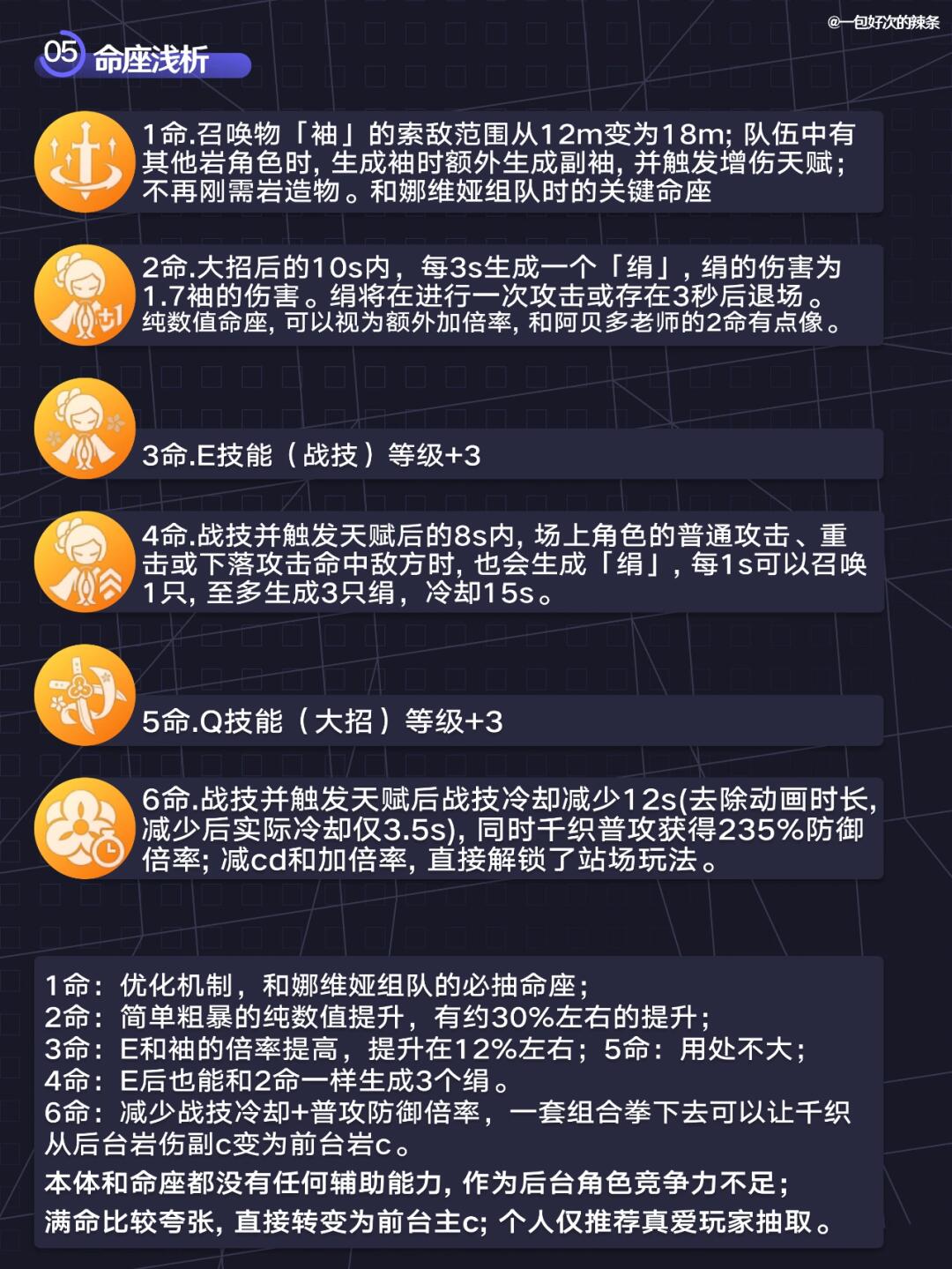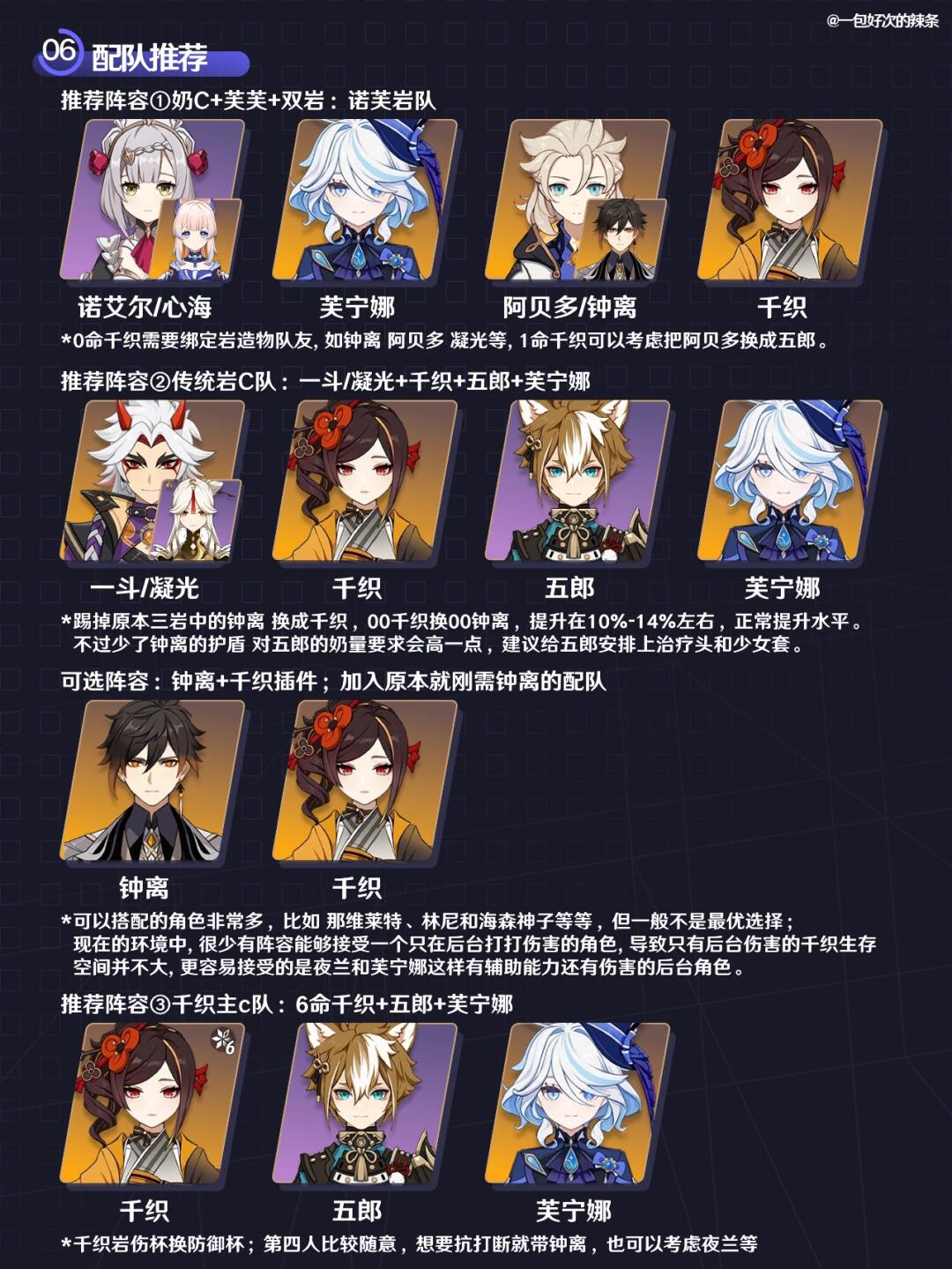 千织有着优秀的数值,但没有什么亮眼的机制,非满命的千织,除了后台伤害什么都没有,现在很少有阵容能够接受一个只在后台打打伤害的角色,这也导致只有后台伤害的千织生存空间并不大,最优的就业队伍就是老岩队;现版本更容易被接受的是夜兰和芙宁娜这样有辅助能力、功能性和伤害兼顾的后台角色。