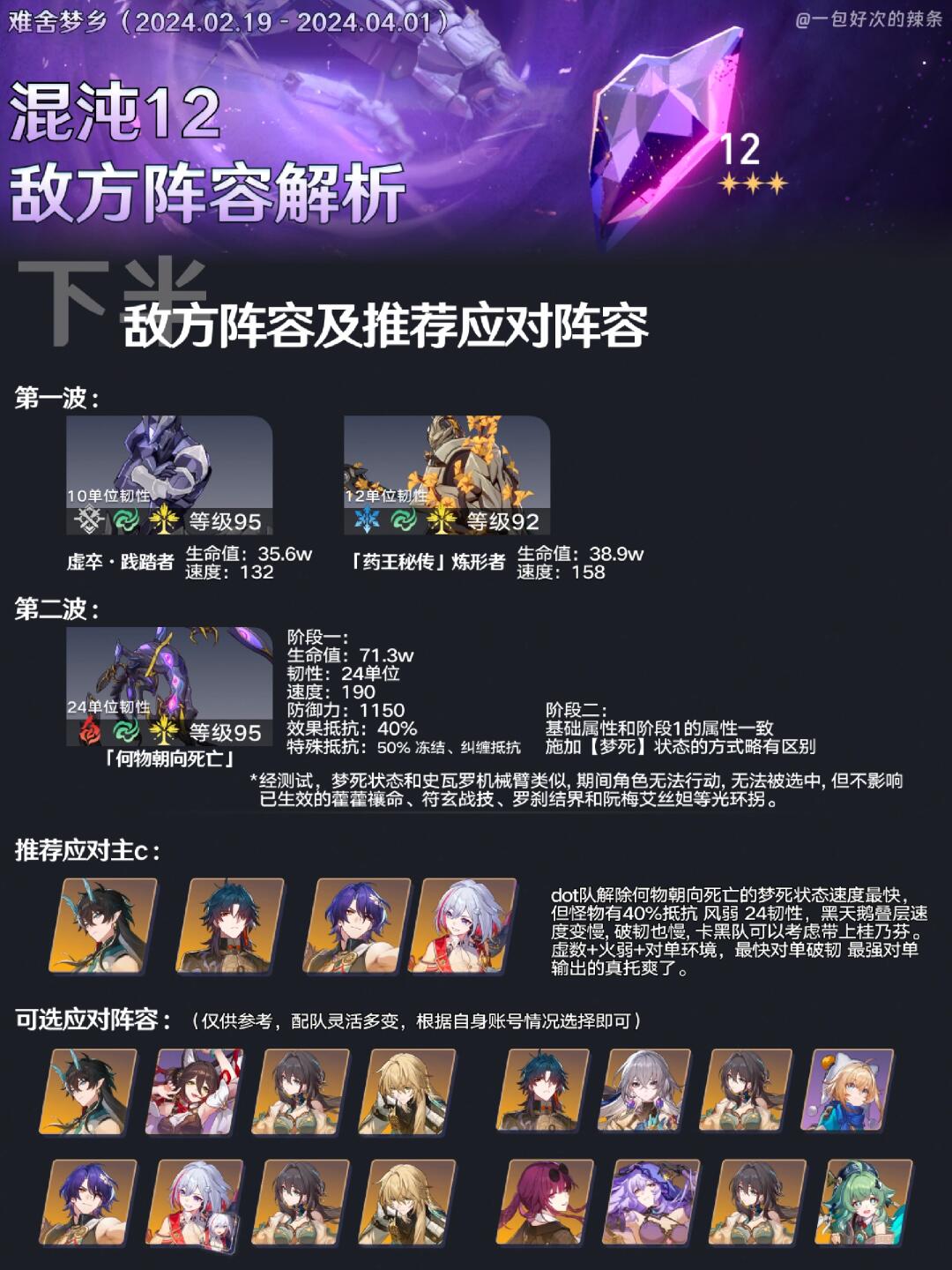 下半第二波就是死亡,火 风 虚数弱点 24韧性+40%效果抵抗 卡黑dot队虽然解梦死状态最快,但是破韧慢,40%抵抗对于黑天鹅的命中要求也更高,需要157%命中才能100%生效,如果用120%命中的黑天鹅,会降低叠层速度,从而降低总伤;不是说卡黑不能打,只是说有一些劣势。