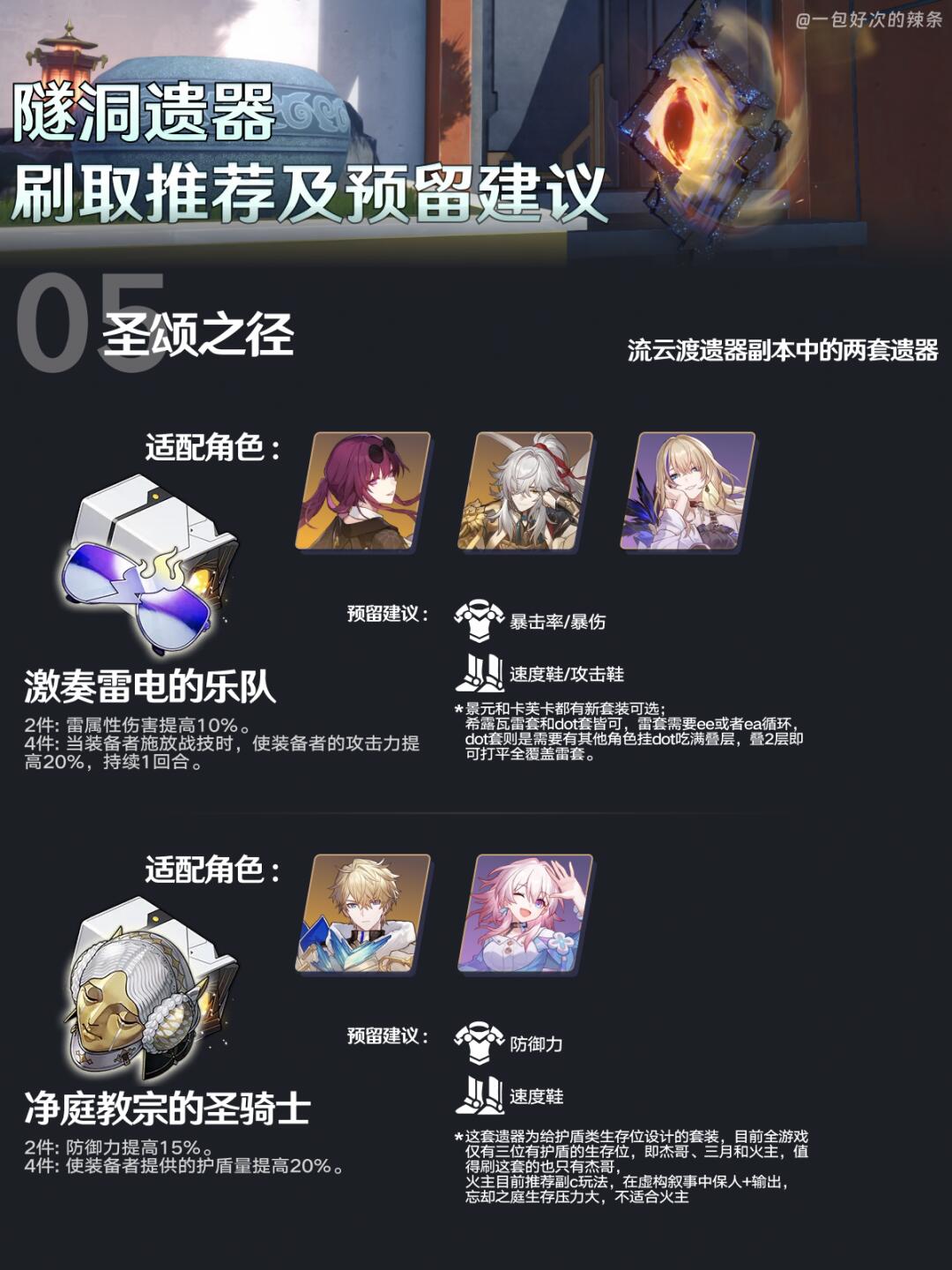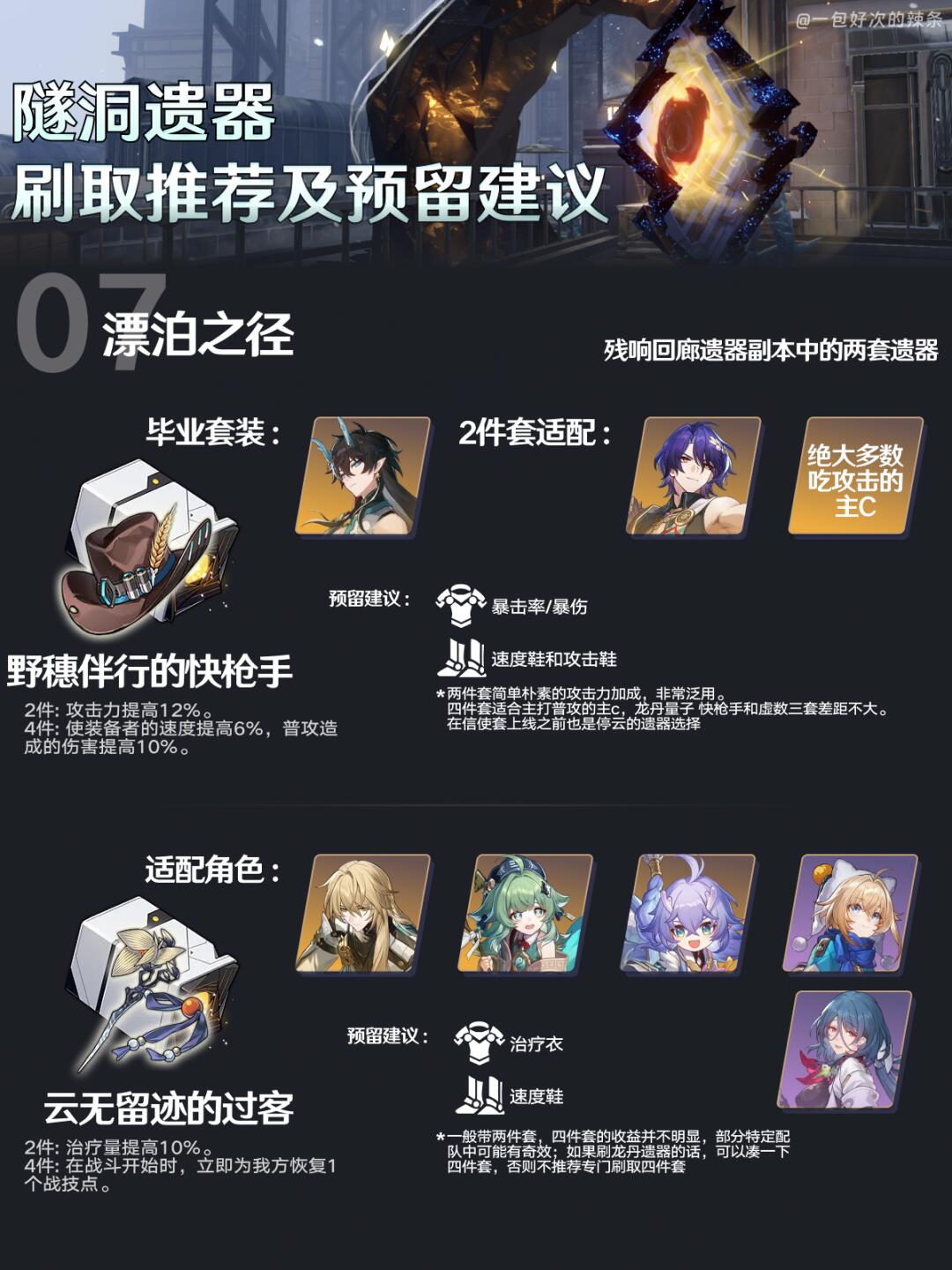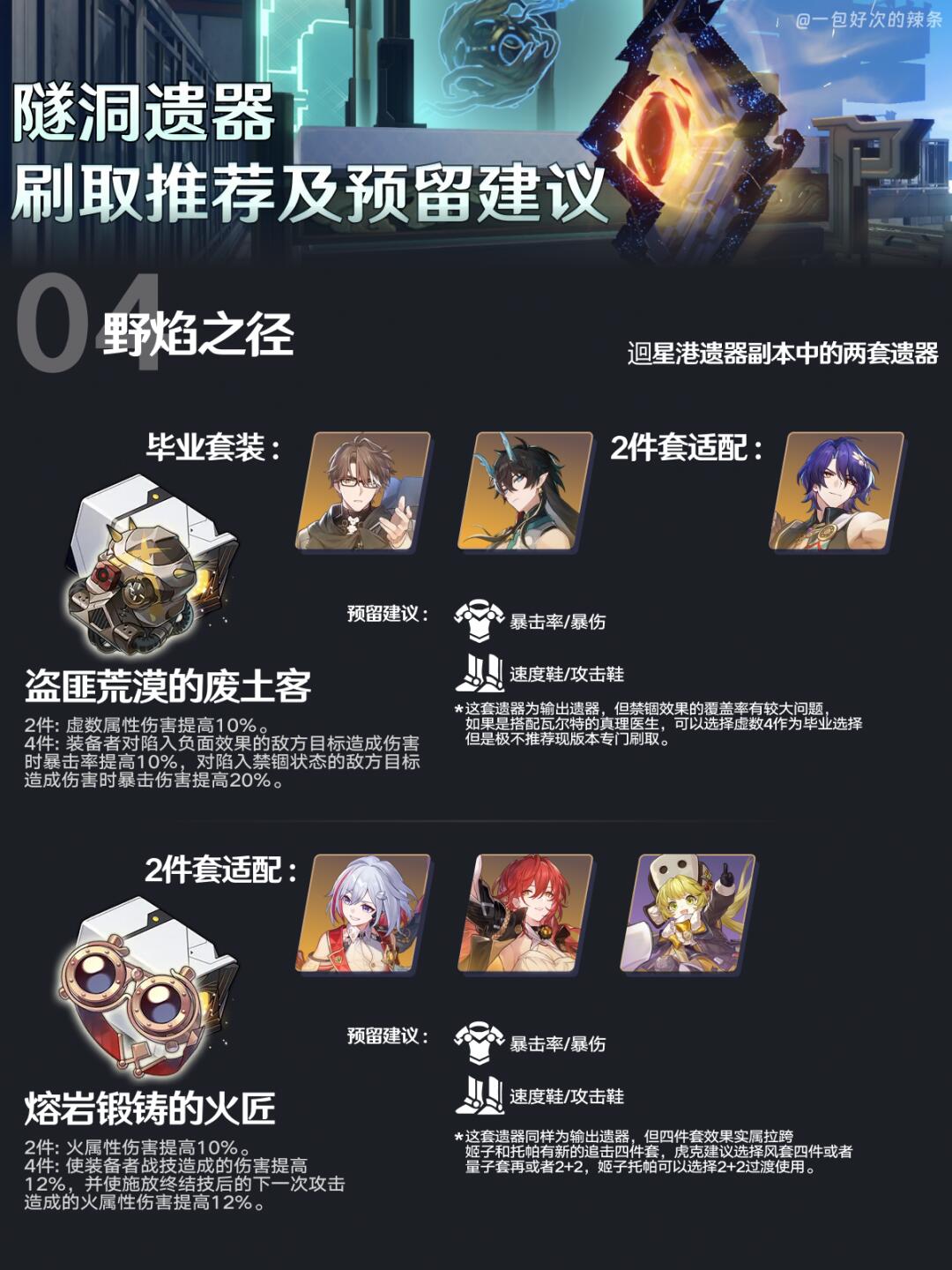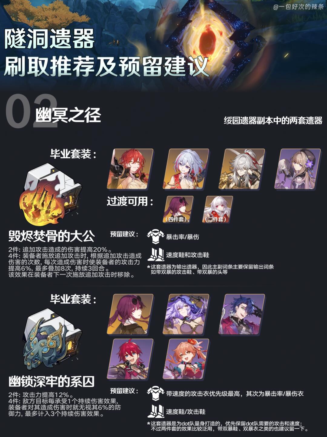 本篇会以“毕业套装”和“适配角色”来区分“输出/主C”的遗器选择优劣; 比如卡芙卡最优选择是dot套,那dot套就是毕业套装;卡芙卡也能带雷套和追击套,但期望伤害不如dot套,那这两套就是适配套装。 而辅助角色在不同配队中的最优遗器可能会有出入,辅助角色就看个人账号情况了,比如停云可以带信使套,也可以带风套。