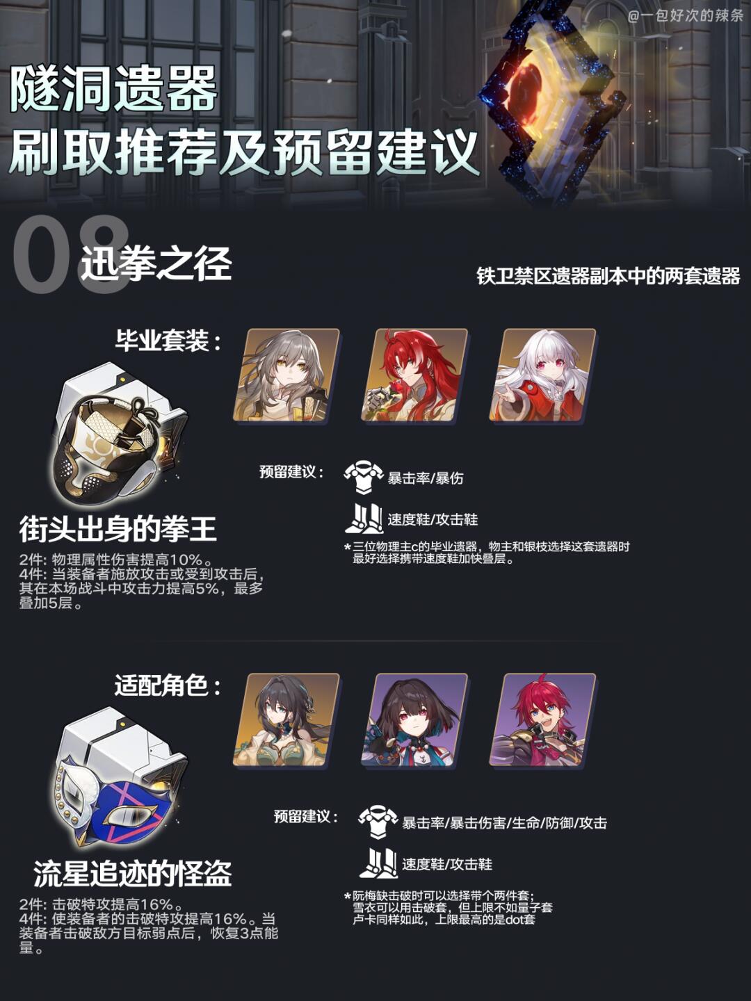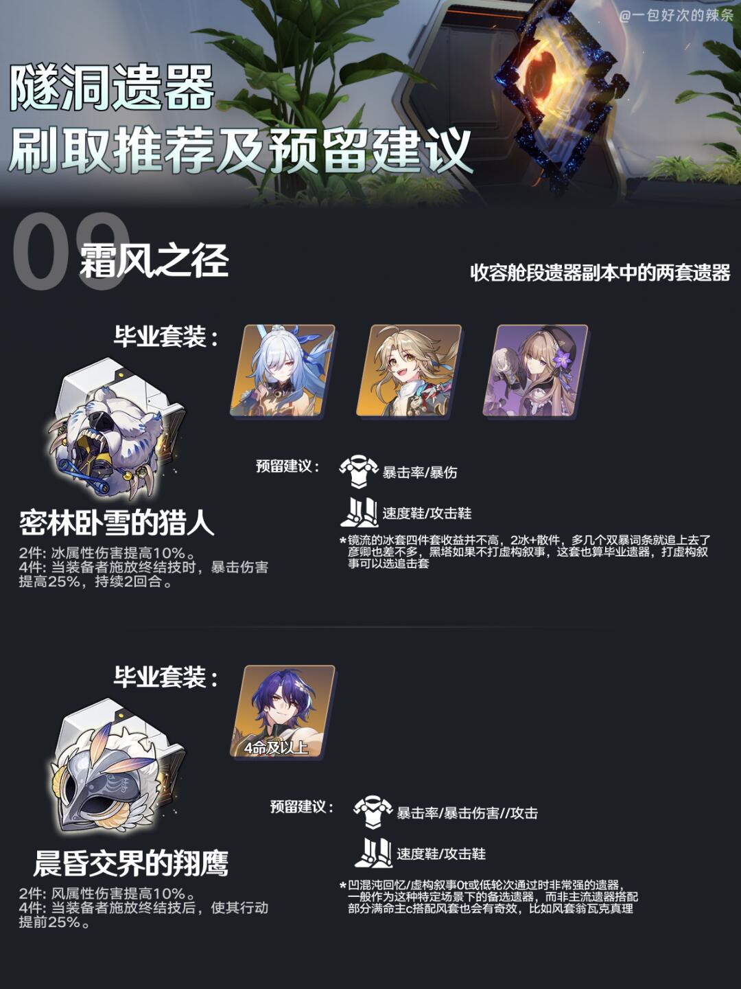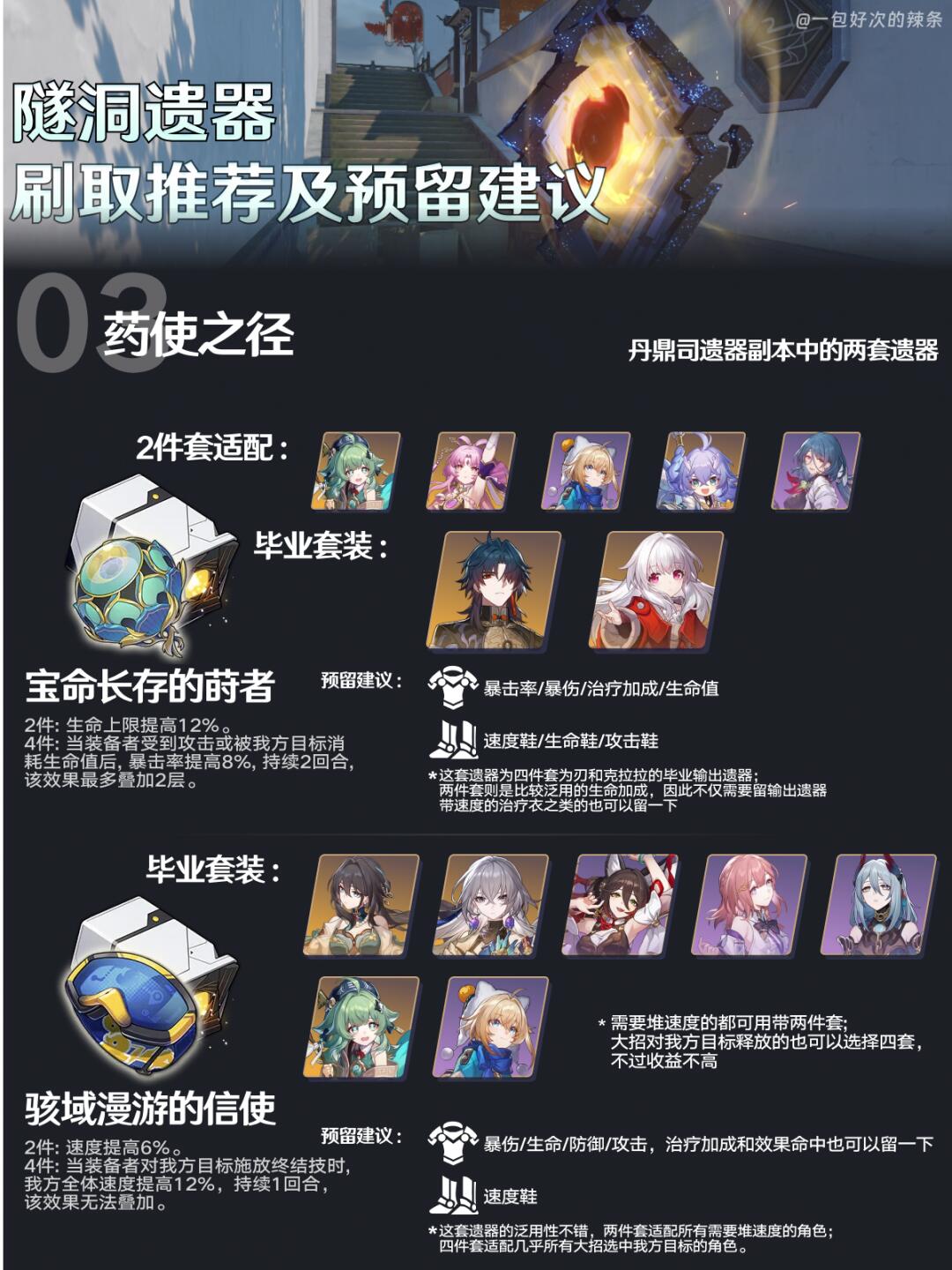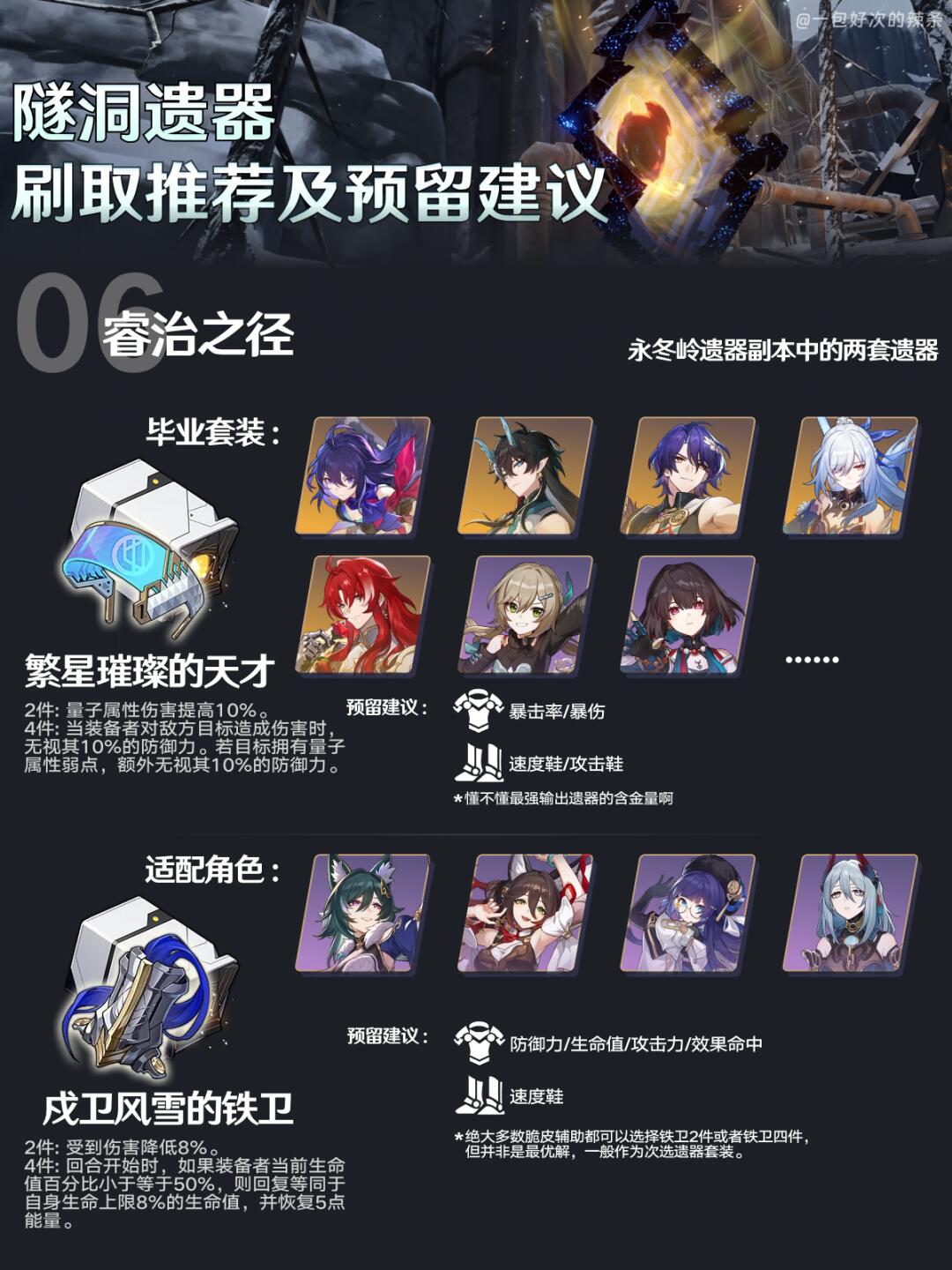 本篇会以“毕业套装”和“适配角色”来区分“输出/主C”的遗器选择优劣; 比如卡芙卡最优选择是dot套,那dot套就是毕业套装;卡芙卡也能带雷套和追击套,但期望伤害不如dot套,那这两套就是适配套装。 而辅助角色在不同配队中的最优遗器可能会有出入,辅助角色就看个人账号情况了,比如停云可以带信使套,也可以带风套。