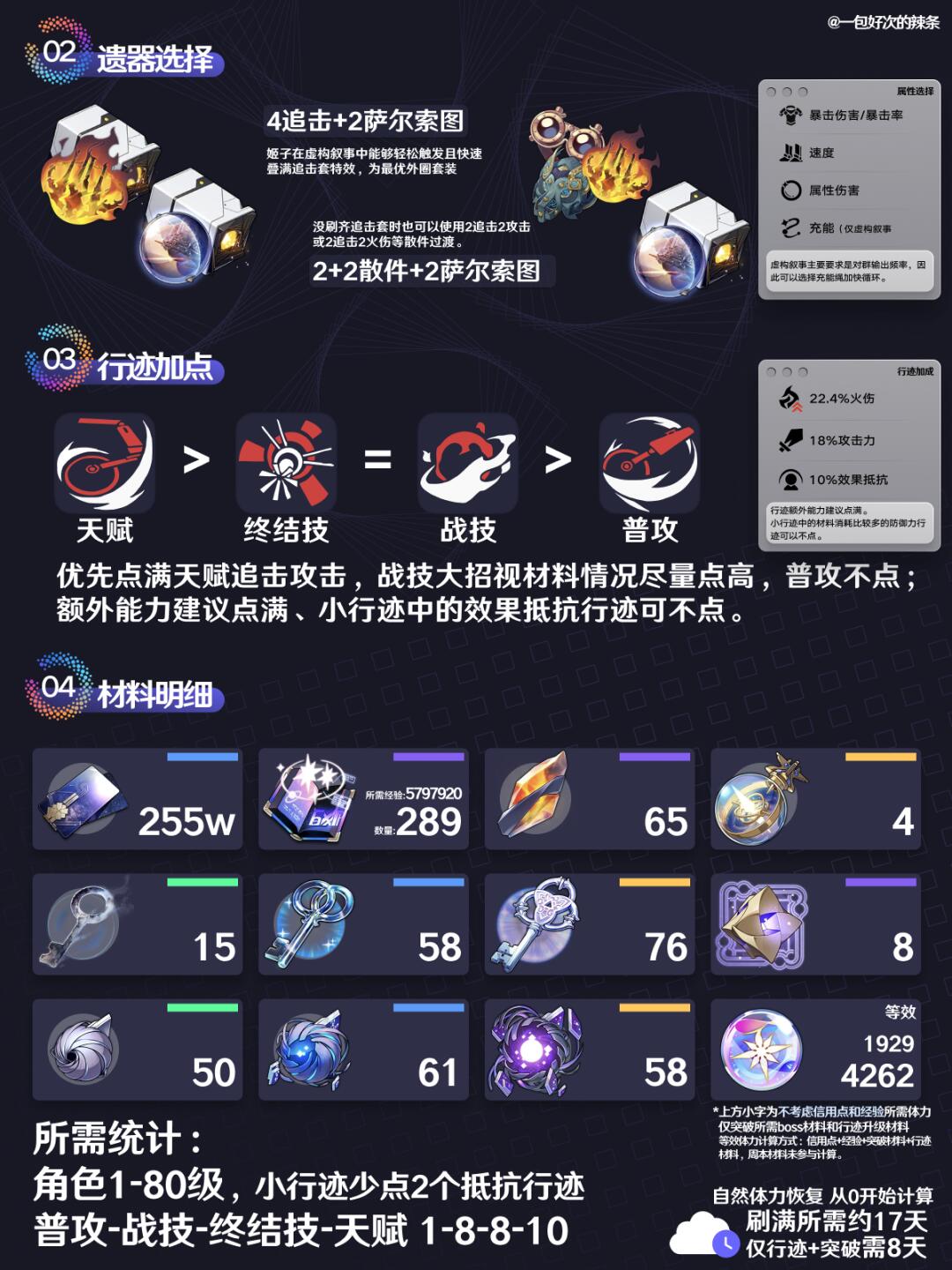 虚构叙事要求的是输出频率,而非输出量,完全是给银枝姬子和黑塔智识3c准备的。 如果打不满虚构叙事,只需要练只黑塔或姬子老师,轻轻松松打满半场4w分,另外半场拿个巡猎刮个2w分就满星了