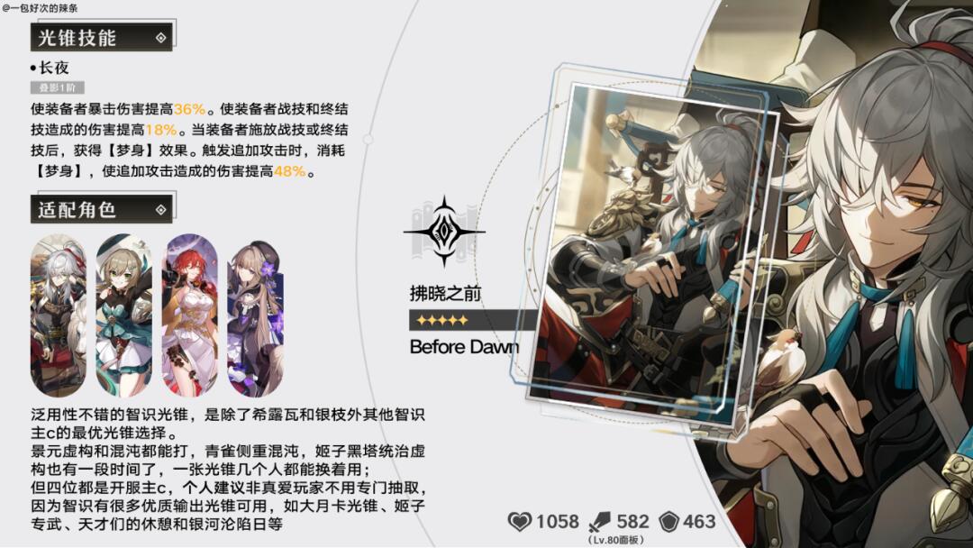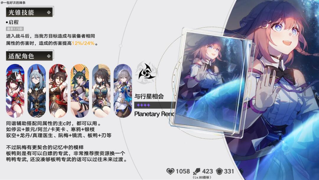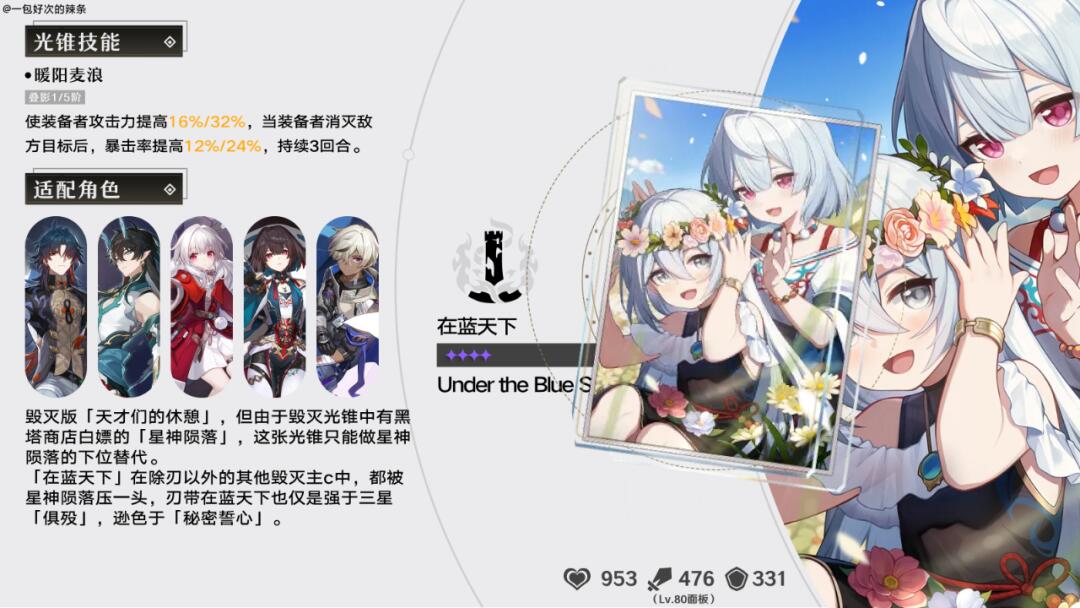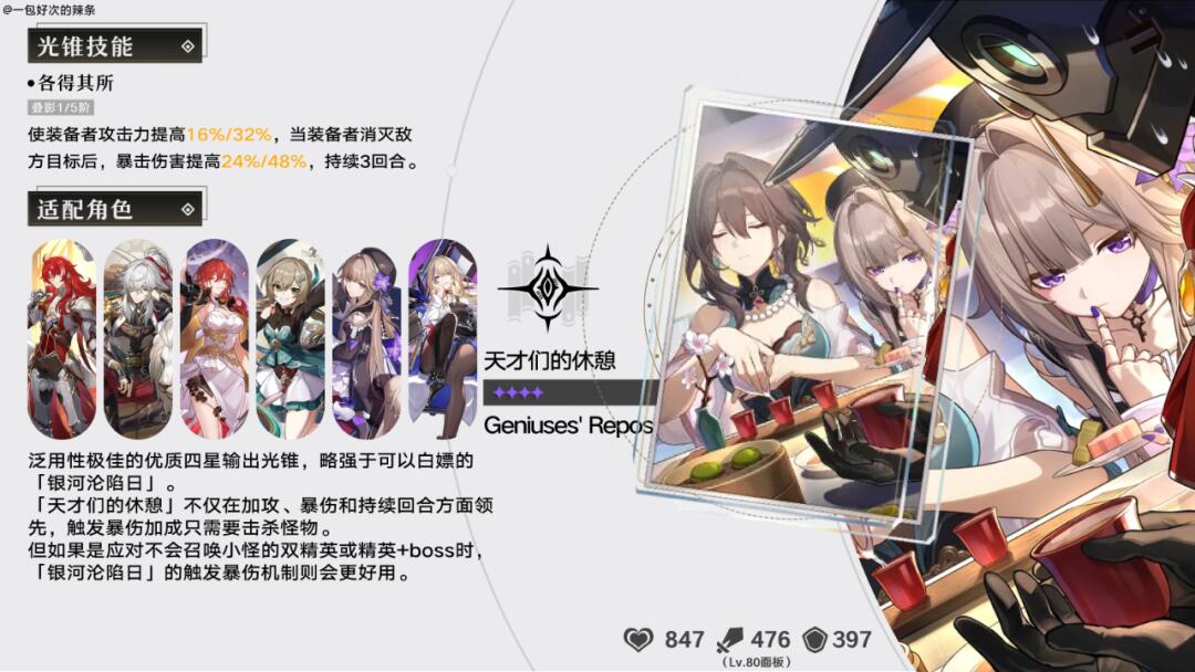 毁灭版「天才们的休憩」,特效只是把暴伤换成暴击率而已,但这张光锥的风评却不如天才们的休憩